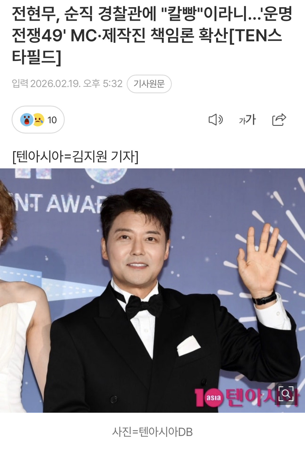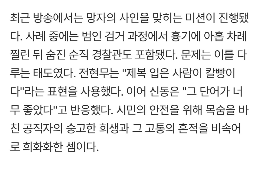 [여시뉴스데스크]전현무, 순직 경찰관에 "칼빵"이라니…'운명전쟁49' MC·제작진 책임론 확산 작성자십육초|작성시간26.02.19|조회수99,936 목록 댓글 190 글자크기 작게가 글자크기 크게가 출처: https://m.entertain.naver.com/home/article/312/0000748597전현무, 순직 경찰관에 "칼빵"이라니…'운명전쟁49' MC·제작진 책임론 확산[TEN스타필드]여기를 눌러 링크를 확인하세요m.entertain.naver.com 다음검색 현재 게시글 추가 기능 열기 북마크 공유하기 신고 센터로 신고 댓글 댓글 190 댓글쓰기 답글쓰기 댓글 리스트 작성자딥치즈 베이컨 포테이토 | 작성시간 26.02.20 돌았나? 제발 인간이기를 포기하지 마라 작성자yunddolddoli! | 작성시간 26.02.21 자기네들끼리 닭살돋는다 오두방정에 소름끼쳐하고 박나래 과한 리액션과 신동의 낄낄거림 진짜 보기싫어서 껏음. 작성자브라키오 | 작성시간 26.02.22 욕하기도 지친다..언제 안나오냐 작성자똑시가되자 | 작성시간 26.02.25 그만보고싶어 작성자하이렁렁 | 작성시간 26.02.28 미친 고인 심지어 순직하신 분께 말뽄새 돌았네 .. 댓글 전체보기