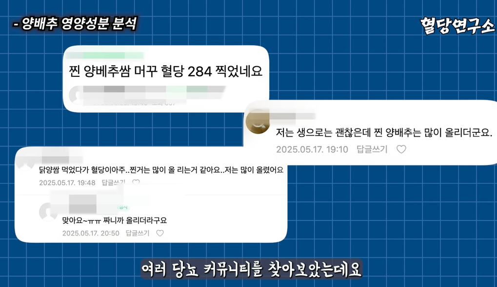 찐양배추는 혈당이 (채소 치고) 많이 오른다는 의견이 많았다고 함