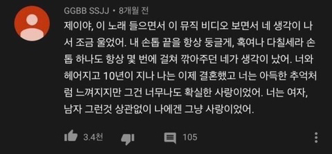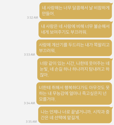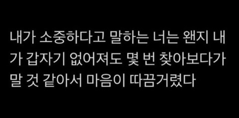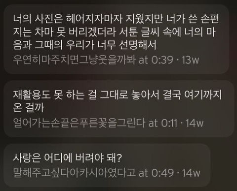 작성자lknlknlks 작성시간 26.02.20 사랑한다는 말에 한번도 대답해주지 못했던 치사한 내가 부끄럽다 사실 늘 나도 말하고 싶었어 많이 사랑했어