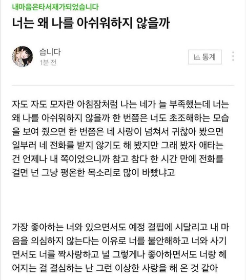 작성자한옥 작성시간 26.02.20 너는 왜 나를 아쉬워하지 않을까