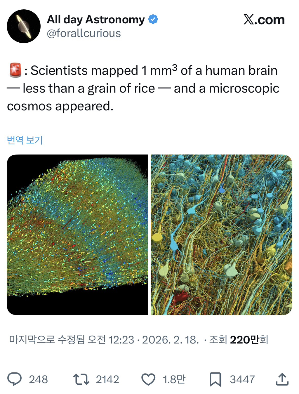 번역: 과학자들이 쌀 한 톨보다 작은 1mm³의 인간 뇌를 매핑하자, 그 속에서 미시적 우주가 모습을 드러냈습니다.