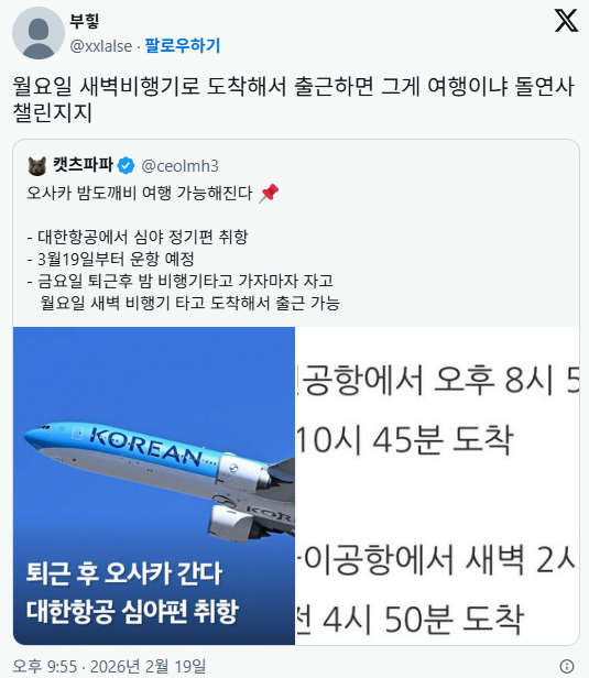 작성자제제쓰 작성시간 26.02.21 30대 중반인데 스케쥴 근무제라 금요일 밤비행기 ~ 월요일 아침비행기로 와서 낮에 푹 자고 월요일 저녁 출근하는거 1년에 최소 한번씩은 하는 중ㅋㅋㅋ근데 아침에 도착해서 아침출근은 진짜 광기인듯ㄷㄷ