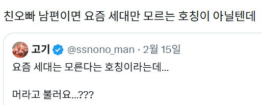 [흥미돋]친오빠의 남편을 뭐라 불러야 되지?? 작성자퐁듀|작성시간26.02.20|조회수21,950 목록 댓글 66 글자크기 작게가 글자크기 크게가 출처: https://theqoo.net/square/4097901776 다음검색 현재 게시글 추가 기능 열기 북마크 공유하기 신고 센터로 신고 댓글 댓글 66 댓글쓰기 답글쓰기 댓글 리스트 작성자은혜의반삭 | 작성시간 26.02.20 새오빠 ㅋㅋㅋㅋㅋㅋㅋㅋㅋㅋㅋㅋ ㅁㅊ 작성자온리준영 | 작성시간 26.02.20 새오빸ㅋㅋㅋㅋㅋㅋㅋㅋㅅㅂㅋㅋㅋㅋㅋㅋㅋㅋㅋㅋㅋㅋㅋ 작성자Chloe | 작성시간 26.02.20 새오빠 작성자로즈토네르 | 작성시간 26.02.20 아무래도 새오빠가 아닐까 작성자둥지냉면 | 작성시간 26.02.20 새오빠ㅋㅋㅋㅋㅋㅋㅅㅂㅋㅋㅋㅋㅋㅋ 댓글 전체보기