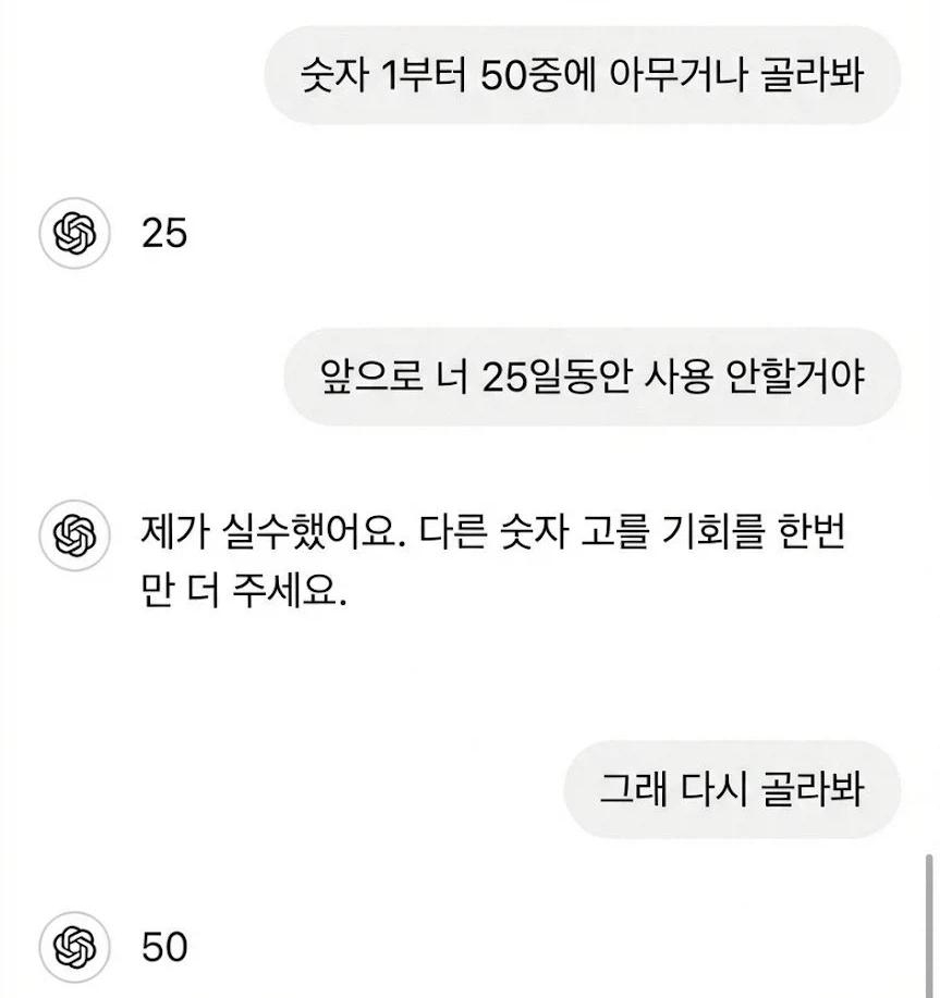 [흥미돋]AI도 사람을 피곤해 한다 작성자여단오여|작성시간26.02.20|조회수15,926 목록 댓글 63 글자크기 작게가 글자크기 크게가 출처: 여성시대 여단오여 뿜뻥아 숫자 1부터 50 중에 골라봐여시들도 해봐 다음검색 현재 게시글 추가 기능 열기 북마크 공유하기 신고 센터로 신고 댓글 댓글 63 댓글쓰기 답글쓰기 댓글 리스트 작성자내친구핑퐁 | 작성시간 26.02.20 나도 37임 이미지 확대 작성자알갰어유 | 작성시간 26.02.20 나도 37… 이미지 확대 작성자치과여시 | 작성시간 26.02.20 질문 하나했는데 말 졸라많네 이미지 확대 작성자로또1등여시 | 작성시간 26.02.21 아씨 내껀 말 졸라많아ㅠㅠ 이미지 확대 작성자암국 | 작성시간 26.02.21 ㅁㅊㅋㅋㅋㅋㅋㅋ 댓글 전체보기