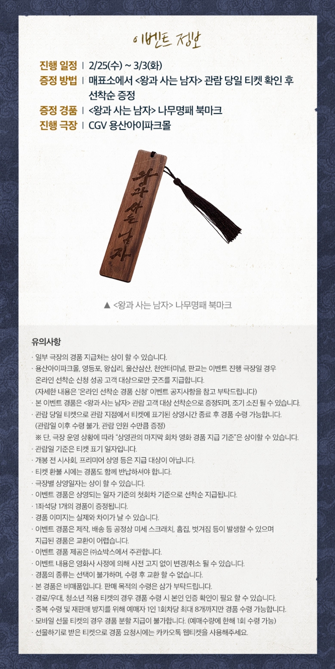 [흥미돋]<왕과 사는 남자> 관람객 나무명패 선착순 증정 이벤트.jpg 작성자스피또띠아|작성시간26.02.20|조회수35,716 목록 댓글 26 글자크기 작게가 글자크기 크게가 출처: 여성시대 스피또띠아CGV랑 롯데시네마 일부 지점에서 진행ㅈㄴ 갖고싶다CGV롯데시네마https://cgv.co.kr/mShrtU/2NeTn깊이 빠져 보다, CGV영화 그 이상의 다양한 몰입의 경험을 만듭니다. DEEP DIVE SPACE, CGVcgv.co.krhttps://www.lottecinema.co.kr/NLCMW/Event/EventTemplateInfo?eventId=201010016926160이벤트 - 롯데시네마여기를 눌러 링크를 확인하세요www.lottecinema.co.kr 다음검색 현재 게시글 추가 기능 열기 북마크 공유하기 신고 센터로 신고 댓글 댓글 26 댓글쓰기 답글쓰기 댓글 리스트 작성자주먹도끼 이기영 | 작성시간 26.02.20 명패인데 이름으로 했어야지!! 작성자모르는 개 산쳌 | 작성시간 26.02.20 아 이홍위 엄흥도ㅡㅡ 작성자Eeee00 | 작성시간 26.02.20 명패인데 이름을 넣었어야 ㅡㅡ 그래도 갖고 싶네 작성자노네임우먼 | 작성시간 26.02.21 감다뒤...이름으로 해주지ㅜㅜㅜ그래도 갖고싶다 작성자선택적생태 | 작성시간 26.02.21 아 바보야 댓글 전체보기