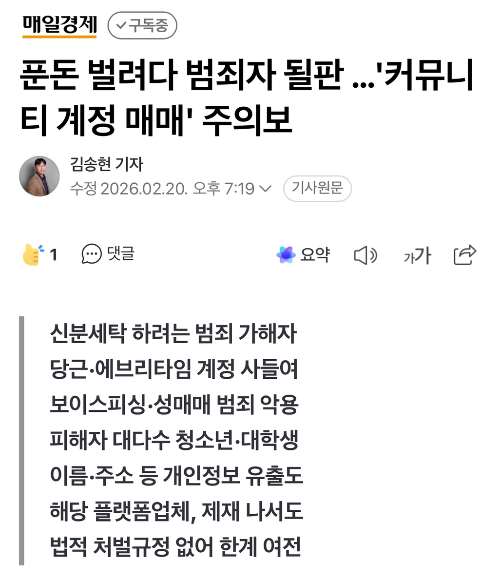 실제로 이러한 계정 매매는 사이버범죄에 악용될 가능성이 크다. 구매한 계정을 이용해 신분을 숨기고 보이스피싱이나 온라인 도박 등 범죄를 저지른 후 수사가 지연되는 틈을 타 도주하는 식이다.