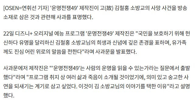 [여시뉴스데스크][공식] '운명전쟁49', 순직 소방관 고인모독 논란에..."숭고함 되새기는 계기 삶고파" 작성자오리털빵빵|작성시간26.02.20|조회수19,465 목록 댓글 26 글자크기 작게가 글자크기 크게가 출처: [공식] '운명전쟁49', 순직 소방관 고인모독 논란에..."숭고함 되새기는 계기 삶고파" (전문) [공식] '운명전쟁49', 순직 소방관 고인모독 논란에..."숭고함 되새기는 계기 삶고파" (전문)공식 운명전쟁49, 순직 소방관 고인모독 논란에...숭고함 되새기는 계기 삶고파 전문www.chosun.com운명전쟁 제작진 공식 입장으로 사과문 떳네이제 좀 조용할듯.. 다음검색 현재 게시글 추가 기능 열기 북마크 공유하기 신고 센터로 신고 댓글 댓글 26 댓글쓰기 답글쓰기 댓글 리스트 작성자비혼주의다 | 작성시간 26.02.21 폐지해,, 작성자에헤라디야앜 | 작성시간 26.02.21 미쳤구만 정말.. 작성자오호오오오유휴우 | 작성시간 26.02.21 계기로 삼고 싶다.계기 삼고파.계기 삶고파?저게 맞는 표현인가? 답댓글 작성자오호오오오유휴우 | 작성시간 26.02.21 이걸 떠나서.. 고인에 대한 예의가 아닌듯 합니다요 ㅠㅠ 이게 뭐람.. 작성자페퍼민트ㅌi | 작성시간 26.02.21 ??????? 댓글 전체보기
