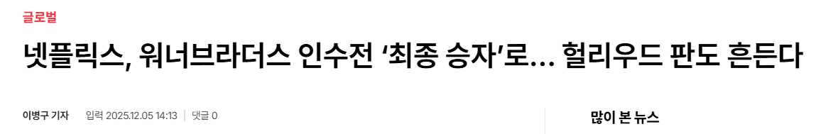 오늘 넷플릭스가 워너브라더스 인수전에 승리를 했는데