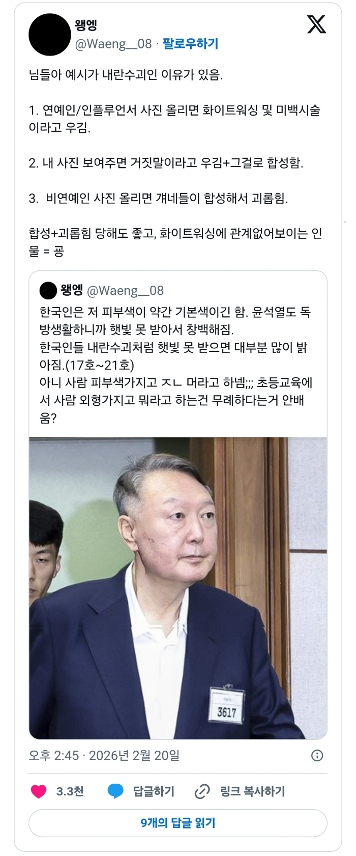 [흥미돋]한국인 피부톤 예시 사진으로 내란수괴 사진을 쓴 이유 작성자아흐레|작성시간26.02.20|조회수25,493 목록 댓글 60 글자크기 작게가 글자크기 크게가 출처: https://x.com/Waeng__08/status/2024721983892758747납득 완 다음검색 현재 게시글 추가 기능 열기 북마크 공유하기 신고 센터로 신고 댓글 댓글 60 댓글쓰기 답글쓰기 댓글 리스트 작성자모로롱롱 | 작성시간 26.02.21 ㅈㄴ 적합 작성자-2kg | 작성시간 26.02.21 ㅋㅋㅋㅋㅋㅋㅋㅋㅋㅋ 작성자다이어때 | 작성시간 26.02.21 ㅋㅋㅋㅋㅋㅋㅋㅋㅋㅋㅋ괴롭히면 그거대로 좋아 작성자시러어어 | 작성시간 26.02.21 ㅅㅂㅋㅋㅋㅋㅋㅋ 작성자lateCheckout | 작성시간 26.02.21 ㅋㅋㅋㅋㅋㅋㅋㅋㅋㅋㅋㅋㅋㅋ 댓글 전체보기