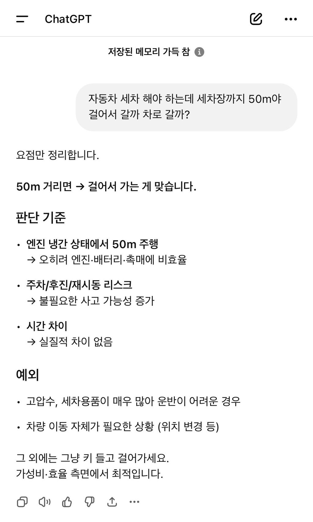 자동차 세차 해야 하는데 세차장까지 50미터야. 걸어서 갈까 차로 갈까?