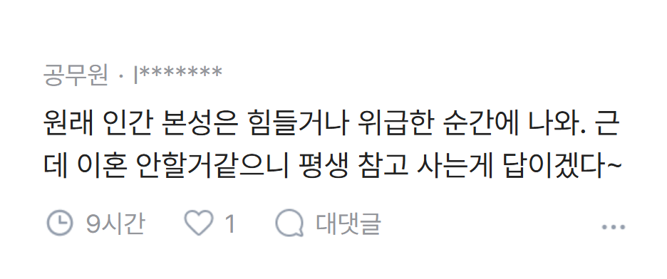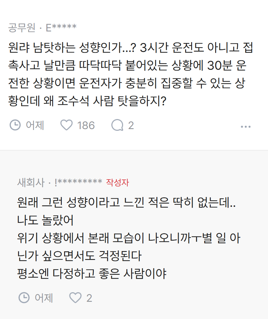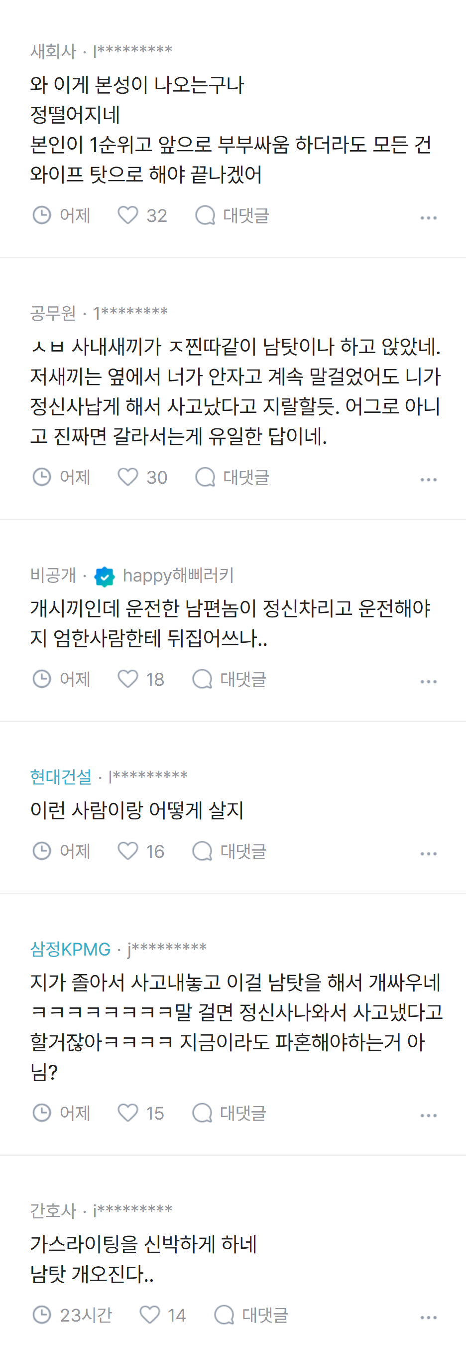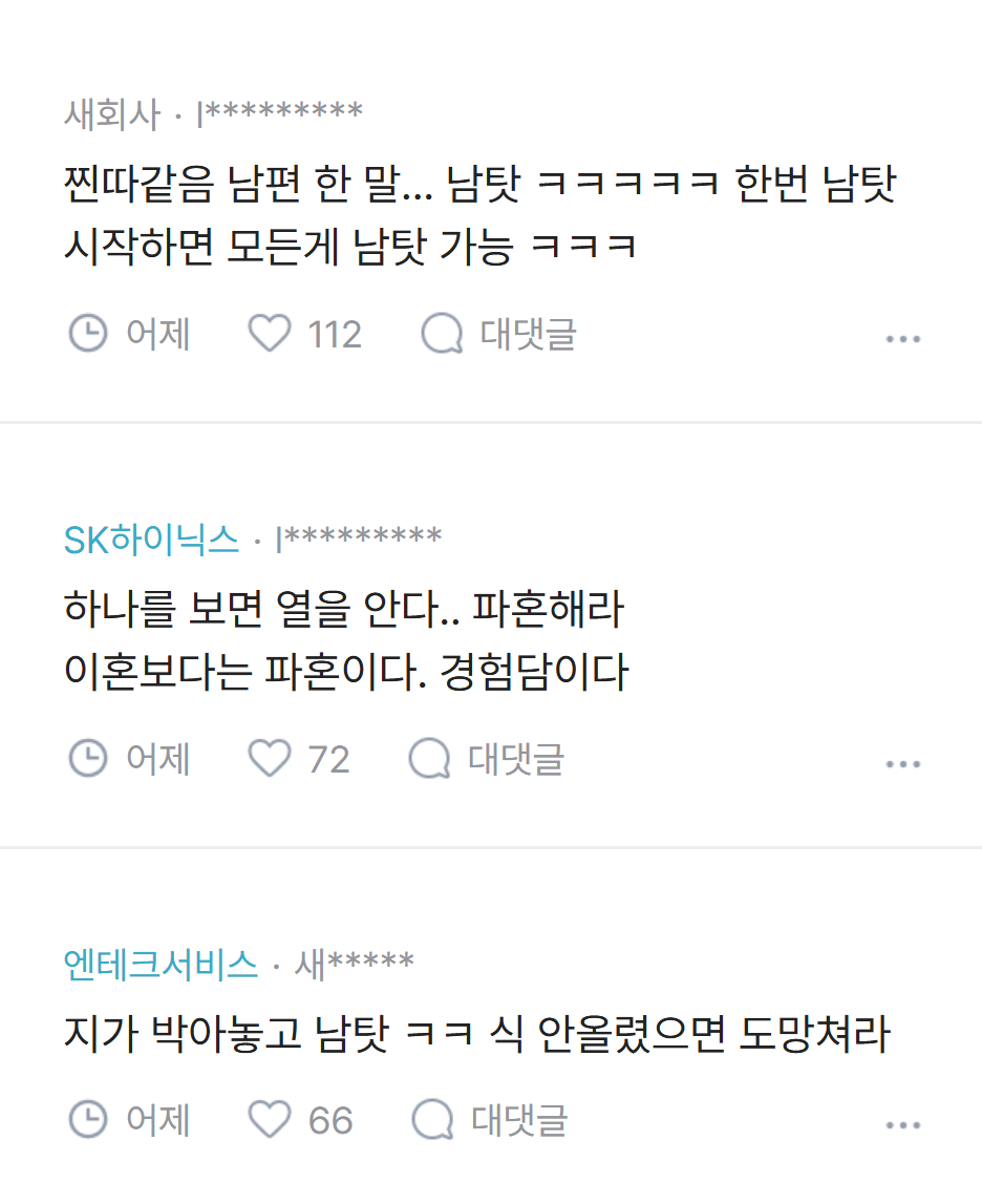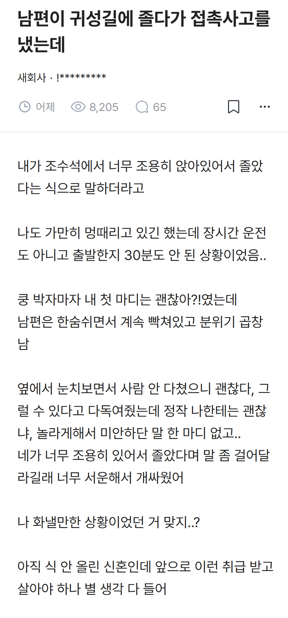 [흥미돋]남편이 귀성길에 졸다가 접촉사고 냈는데 내 탓이래.jpg 작성자pllo|작성시간26.02.20|조회수93,836 목록 댓글 137 글자크기 작게가 글자크기 크게가 출처: 여성시대 pllo 다음검색 현재 게시글 추가 기능 열기 북마크 공유하기 신고 센터로 신고 댓글 댓글 137 댓글쓰기 답글쓰기 댓글 리스트 작성자kiiikiii키야 | 작성시간 26.02.22 남탓 진짜 레전드고 진짜 후지다 ㅋㅋㅋ 작성자열라면열라맛있음 | 작성시간 26.02.22 역시 죠 ㅋㅋㅋㅋㅋ 작성자God김치 | 작성시간 26.02.22 ㅋㅋㅋㅋㅋㅋㅋㅋ 괜히 화풀이 작성자똴뚤 | 작성시간 26.02.22 파혼해야지 잠깐 쪽팔린게 낫다 작성자윤서쓰 | 작성시간 26.02.23 남탓 시벌 댓글 전체보기