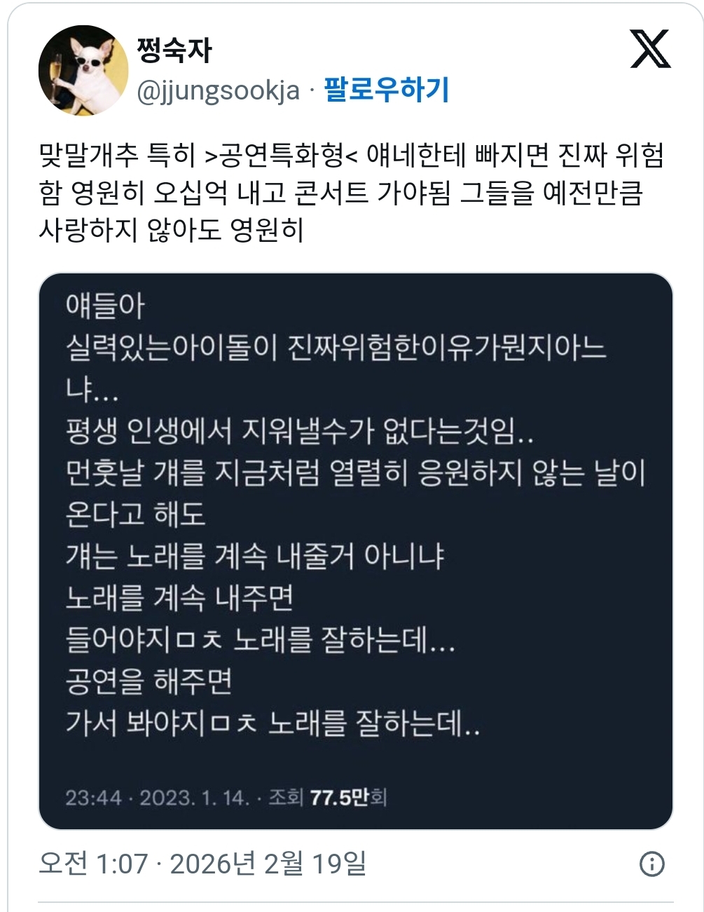 [흥미돋]실력 있는 아이돌이 진짜 위험한 이유 작성자헤그리|작성시간26.02.21|조회수107,897 목록 댓글 135 글자크기 작게가 글자크기 크게가 출처: https://theqoo.net/square/4100438300나도 한때 실력부심으로 덕질했었지만탈덕하니까 생각도 안나던데.. 다음검색 현재 게시글 추가 기능 열기 북마크 공유하기 신고 센터로 신고 댓글 댓글 135 댓글쓰기 답글쓰기 댓글 리스트 작성자나한테 대댓 달지마... | 작성시간 26.02.21 생각안나.. 작성자지9별 | 작성시간 26.02.21 걍 탈덕이 아니신듯 작성자한로이가 | 작성시간 26.02.21 그런 아이돌이 있나? 아직도 콩깍지 끼신듯 작성자임윤찬 | 작성시간 26.02.21 진심 생각도 안남 작성자잭퀘이드 | 작성시간 26.02.21 아이돌 덕질 해본적없고 누구의 팬도 아닌데 난 시간이 지나면 실력파만 기억나더라특히 요즘아이돌 립싱크하고 춤만 추는거 보면 과거 실력파들 생각 더 남효린같이 댓글 전체보기