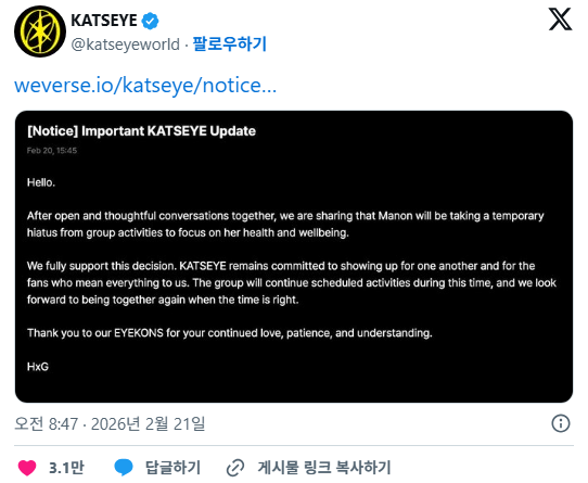 마농이 건강과 웰빙에 집중하기 위해 그룹 활동을 잠시 중단할 예정임을 알려드립니다.