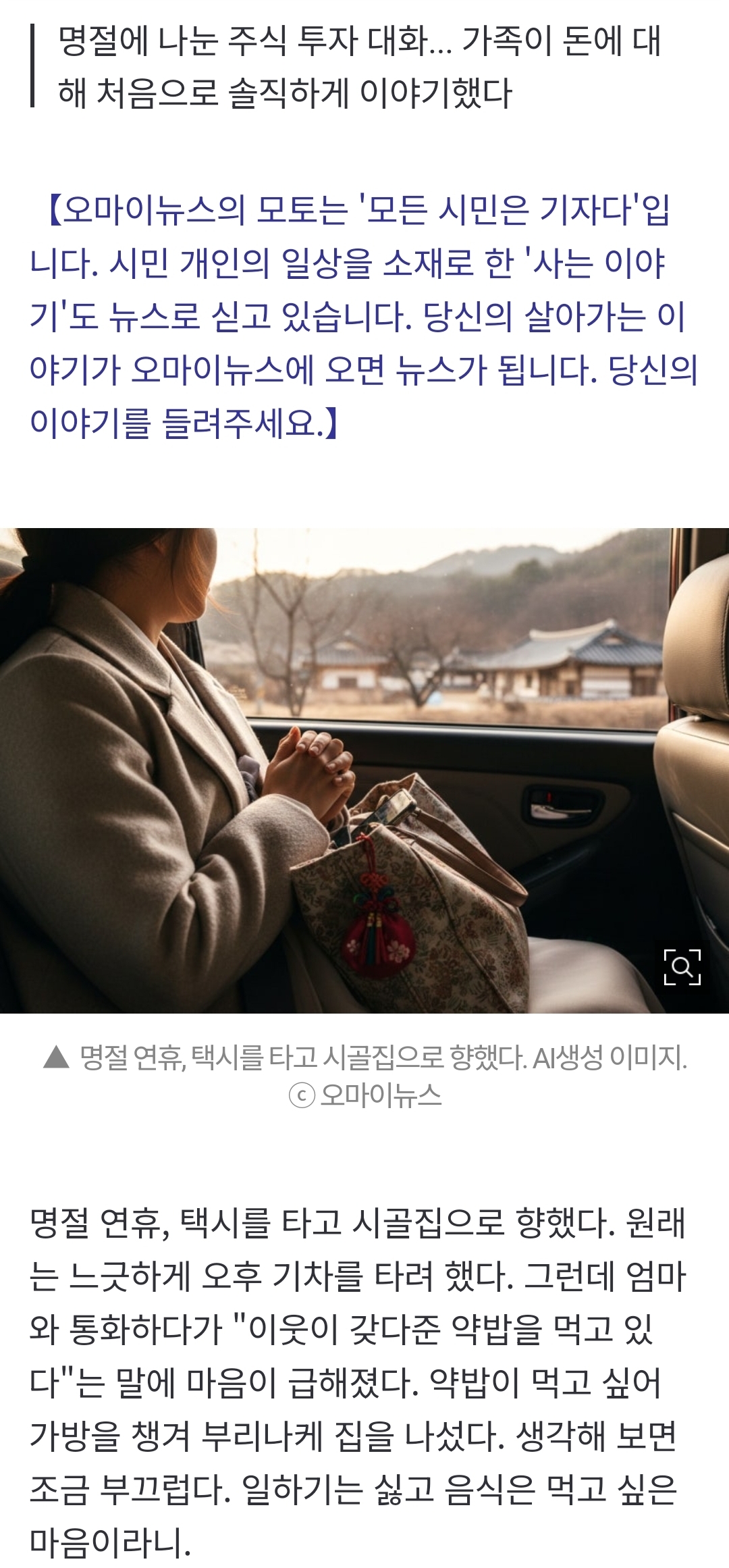 [여시뉴스데스크]세뱃돈 대신 삼성전자 주식 한 주, 5년 뒤 벌어진 일 작성자치와|작성시간26.02.21|조회수10,612 목록 댓글 3 글자크기 작게가 글자크기 크게가 출처: https://naver.me/FP8M1U5L세뱃돈 대신 삼성전자 주식 한 주, 5년 뒤 벌어진 일▲ 명절 연휴, 택시를 타고 시골집으로 향했다. AI생성 이미지. ⓒ 오마이뉴스 명절 연휴, 택시를 타고 시골집으로 향했다. 원래는 느긋하게 오후 기차를 타려 했다. 그런데 엄마와 통화하다가 "n.news.naver.com중략 다음검색 현재 게시글 추가 기능 열기 북마크 공유하기 신고 센터로 신고 댓글 댓글 3 댓글쓰기 답글쓰기 댓글 리스트 작성자춤추는 곰발바닥 | 작성시간 26.02.21 기사 너무 좋다 작성자알밤바밤바 | 작성시간 26.02.21 이런 사는이야기 좋아 작성자담돔다다 | 작성시간 26.02.21 너무 좋은 기사다 댓글 전체보기