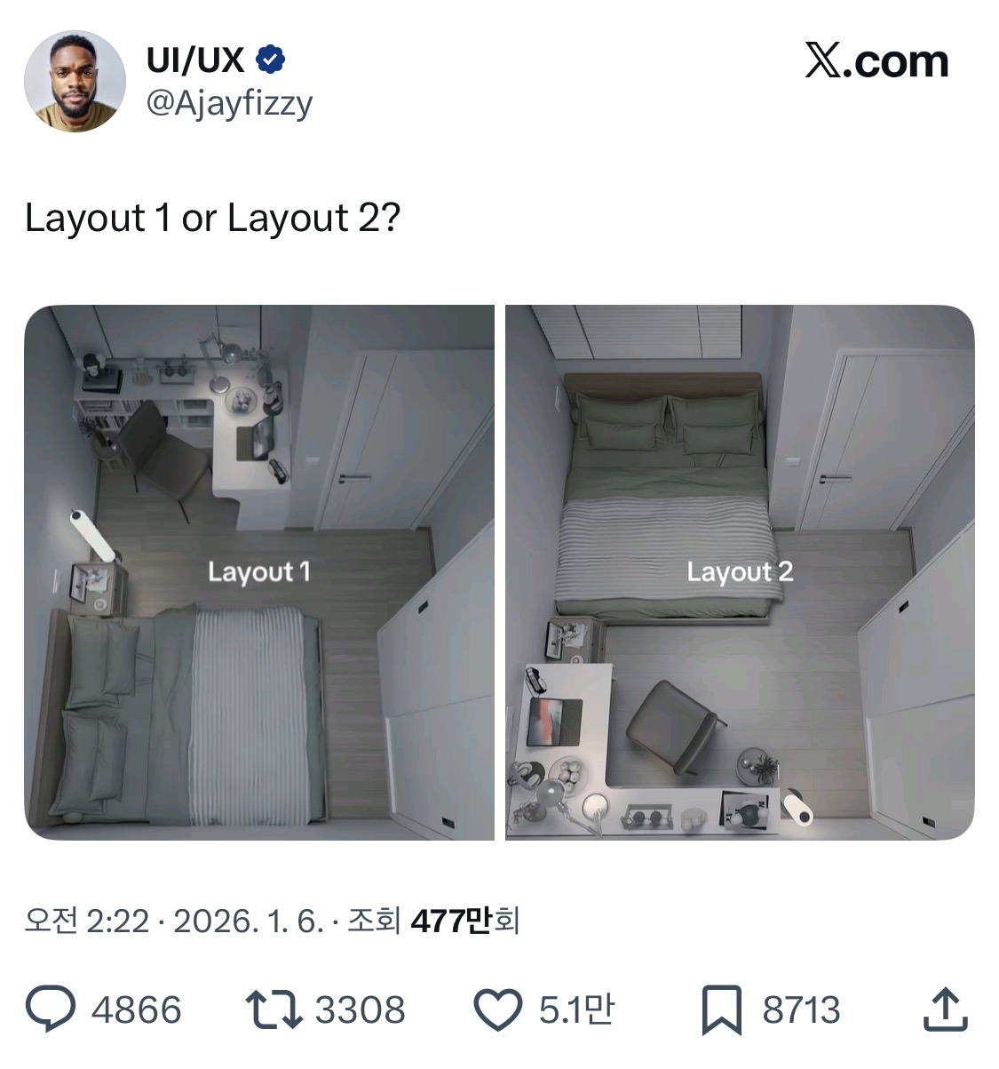 [스크랩] [흥미돋]현재 트위터에서 핫한 방 배치 고르기.twt 작성자에너지샷|작성시간26.02.21|조회수36,097 목록 댓글 209 글자크기 작게가 글자크기 크게가 출처: https://x.com/ajayfizzy/status/2008227636397416484여시의 취향은? 다음검색 스크랩 원문 : *여성시대* 차분한 20대들의 알흠다운 공간 현재 게시글 추가 기능 열기 북마크 공유하기 신고 센터로 신고 댓글 댓글 209 댓글쓰기 답글쓰기 댓글 리스트 작성자레드나무 | 작성시간 26.02.21 1 작성자무삥 | 작성시간 26.02.21 닥1 작성자냐구리 | 작성시간 26.02.21 1 작성자마아트 | 작성시간 26.02.22 1번... 2번은 누가 들어오는지 한 번에 캐치가 안 되어서 불안... 작성자십석열 | 작성시간 26.02.22 1이 좋은데 옷장문이 다 안열리는게 좀 열받음 댓글 전체보기