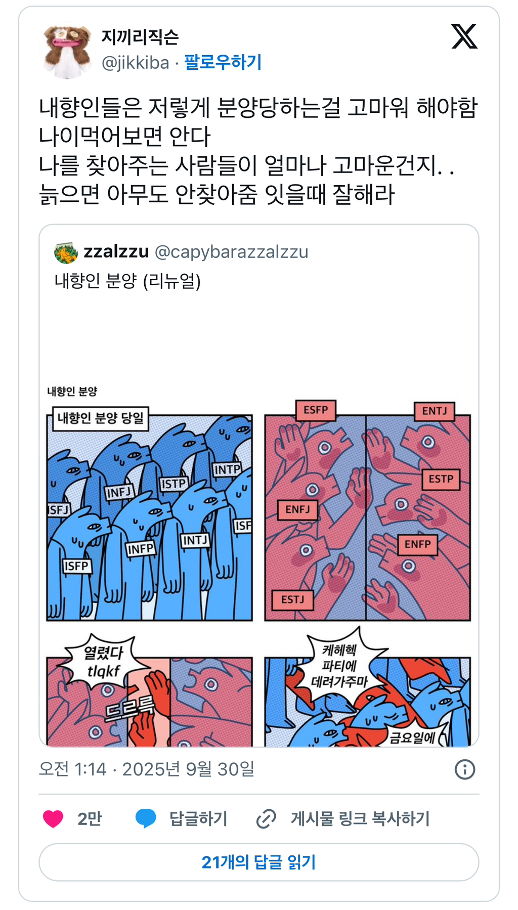 작성자하트파리 작성시간 26.02.21 ㅁㅈ 내 주위 외향인들 서른 넘으니까 자기도 이제 아는 사람들만 챙기고 싶다고 함 ㅜ 엉엉엉 그 전에 날 분양 받아줘서 고마워 엉엉