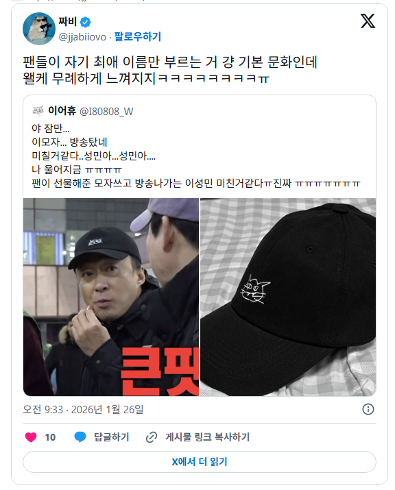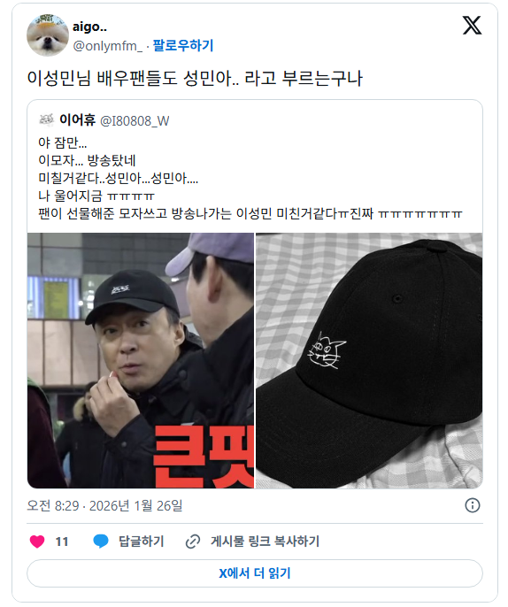 [스크랩] [흥미돋]이성민 배우팬들도 성민아.. 라고 부르는구나... 작성자왜용??|작성시간26.02.21|조회수50,841 목록 댓글 40 글자크기 작게가 글자크기 크게가 출처:https://theqoo.net/hot/4073830125 웃겨서 눈물남 다음검색 스크랩 원문 : *여성시대* 차분한 20대들의 알흠다운 공간 현재 게시글 추가 기능 열기 북마크 공유하기 신고 센터로 신고 댓글 댓글 40 댓글쓰기 답글쓰기 댓글 리스트 작성자가나다나다라마 | 작성시간 26.02.21 어이쿠 작성자햇살 가아득 | 작성시간 26.02.21 팬은 미칠것같다 이성민아름답다 이성민아름답다...한거네ㅋㅋㅋㅋㅋㅋ 작성자몬지알g | 작성시간 26.02.21 컨펌ㅋㅋㅋㅋㅋㅋㅋㅋㅋㅋㅋㅋㅋㅋㅋㅋㅋㅋㅋㅋㅋㅋㅋㅋㅋㅋㅋㅋㅋㅋㅋㅋㅋㅋㅋㅋㅋㅋㅋㅋ 작성자01echo | 작성시간 26.02.21 ㅋㅋㅋㅋㅋㅋㅋㅋㅋㅋㅋㅋㅋ 작성자돌아뿌리버럭시아스 | 작성시간 26.03.19 ㅋㅋㅋㅋㅋㅋㅋ 댓글 전체보기