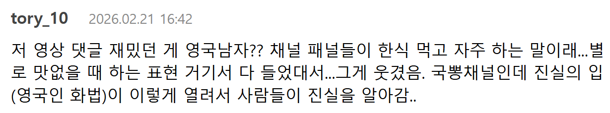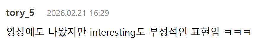 작성자MOJAVE 작성시간 26.02.21 아니 근데 인터레스팅은 걍 한국말로 직역해도 좋은 느낌은 아니긴함ㅋㅋㅋ 음식 먹고 첫마디가