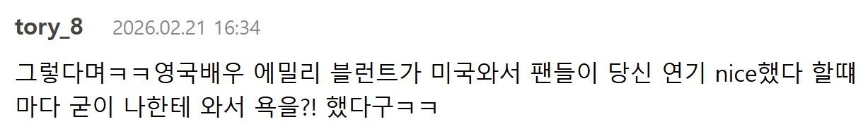 작성자오쏘몰이뮨 작성시간 26.02.21 에밀리 블런트가 기분나쁘다고 한 말은 Nice 아니고 quite good 이었음.