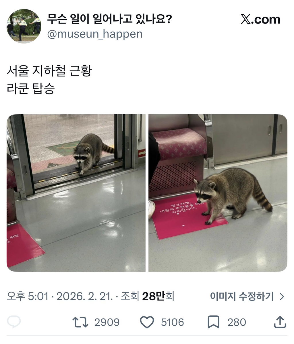 [흥미돋]서울 지하철 근황 작성자Rooose|작성시간26.02.21|조회수53,231 목록 댓글 19 글자크기 작게가 글자크기 크게가 출처: https://x.com/museun_happen/status/2025118773511066072?s=46&t=49r3Kw6TNqvpiTF8J4JDaA 다음검색 현재 게시글 추가 기능 열기 북마크 공유하기 신고 센터로 신고 댓글 댓글 19 댓글쓰기 답글쓰기 댓글 리스트 작성자허니워크 | 작성시간 26.02.21 배경찍고 거기에 합성하는거도되서.. 작성자너는참좋겠다 | 작성시간 26.02.21 라쿤이 너무 ai깔인데 작성자남자는미쳤다 | 작성시간 26.02.21 뚱뚱한 라쿤이 임산부석을 노리고있어요 작성자졸리고 또 졸리고 졸리다 | 작성시간 26.02.21 마 집 나와서 어딜가나 작성자오징어불닭 | 작성시간 26.02.22 첫짤에 지하철 문이 반쪽인댑쇼 댓글 전체보기
