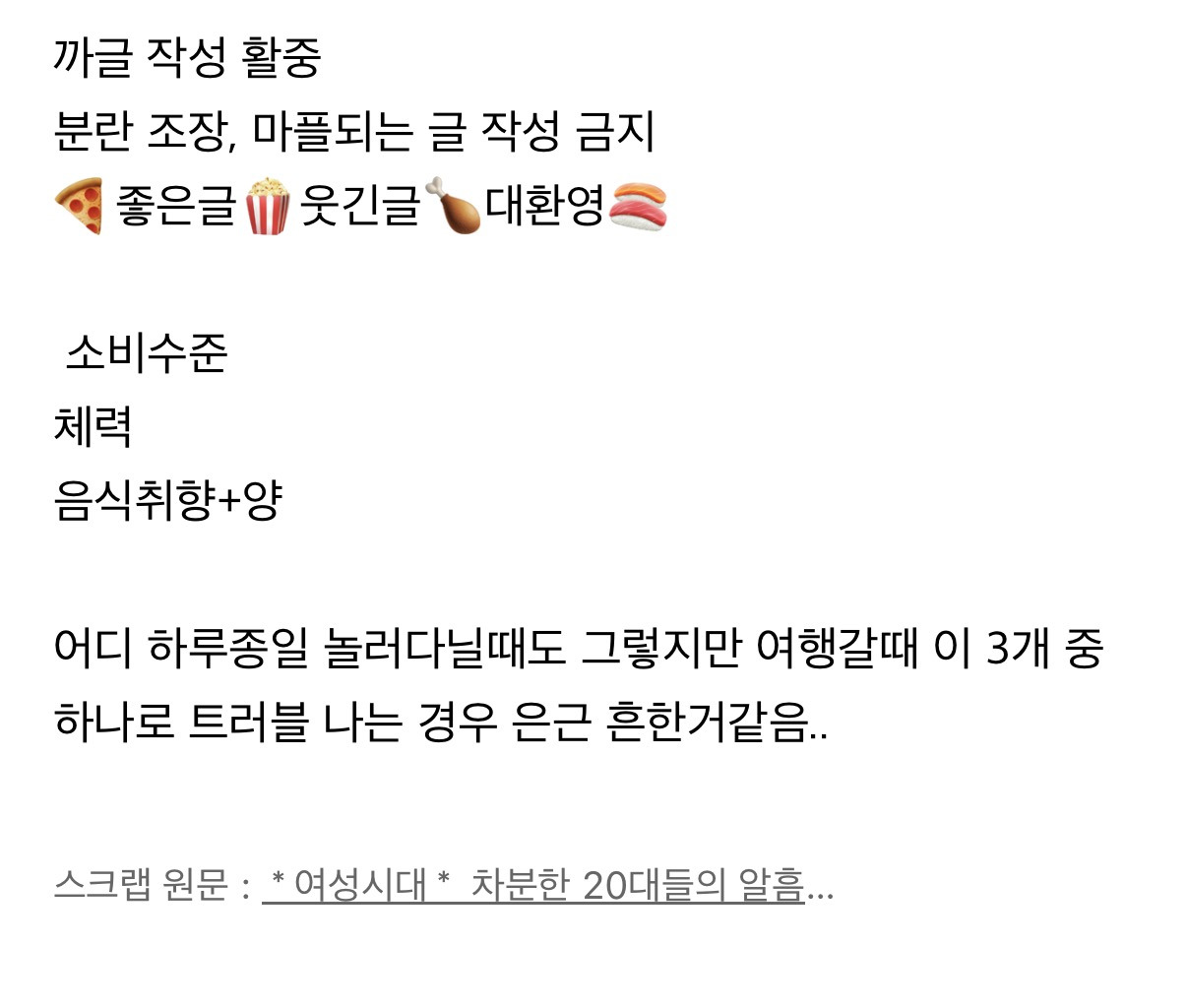 [흥미돋]친구랑 놀러다닐때 성격도 중요하지만 이 3개가 ㄹㅇ 잘맞아야 되는거같은 달글 작성자라이도|작성시간26.02.21|조회수13,868 목록 댓글 37 글자크기 작게가 글자크기 크게가 출처: https://m.cafe.daum.net/subdued20club/ReHf/4959753?svc=cafeapp친구랑 놀러다닐때 성격도 중요하지만 이 3개가 ㄹㅇ 잘맞아야되는거같은 달글여기를 눌러 링크를 확인하세요m.cafe.daum.net스크랩이 막혀서 캡쳐해왔습니다 문제시 알려주세요 . 다음검색 현재 게시글 추가 기능 열기 북마크 공유하기 신고 센터로 신고 댓글 댓글 37 댓글쓰기 답글쓰기 댓글 리스트 작성자Qutsotn | 작성시간 26.02.21 소비수준...이 제일 큰거같아.. 작성자크리스탈 로터리 | 작성시간 26.02.21 위생관념도 중요해요 특히 화장실 작성자이걸스 | 작성시간 26.02.22 음식취향+양 진짜 중요... 작성자카오스집사 | 작성시간 26.02.22 난 1 3 다 맞출 수 있는데 2는 진짜.. 하루에 3만보씩 걷는 여행 하고 싶지 않아 ㅠㅠ 작성자따뜻한 초코나무숲 | 작성시간 26.02.22 소비수준이 제일 중요함 댓글 전체보기