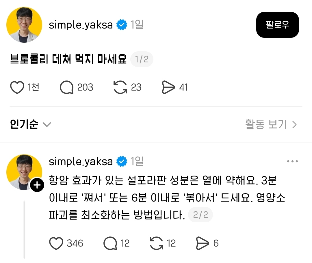 [흥미돋]브로콜리 데쳐먹지 마세요 작성자뽀도도|작성시간26.02.21|조회수33,190 목록 댓글 47 글자크기 작게가 글자크기 크게가 출처: https://www.threads.com/@simple.yaksa/post/DU9ztDJE5yq?xmt=AQF0RIZmG_04dI8zTT4hoiDW5ELetLu99xAwR5QNu22WG2IC4T5QsRDj4Gim_8kTUmTtsTos&slof=1 다음검색 현재 게시글 추가 기능 열기 북마크 공유하기 신고 센터로 신고 댓글 댓글 47 댓글쓰기 답글쓰기 댓글 리스트 작성자가랏 식인친칠라 | 작성시간 26.02.22 쟈갑다 작성자빵떡면 | 작성시간 26.02.22 맛도없는게 거 존나게 귀찮게구네 작성자퐁당퐁당쇼콜라 | 작성시간 26.02.22 벌레 많대서 세척 잘 해야 한담서요.. 그것부터가 너무나 진입장벽... 작성자Love wins all | 작성시간 26.02.22 아존나웃겨 초장발사대 ㅇㅈ 작성자언니 나 사랑하는 개가 생겼어 | 작성시간 26.02.22 근데 데치고 찌고 볶고 다 열아냐??👀 댓글 전체보기