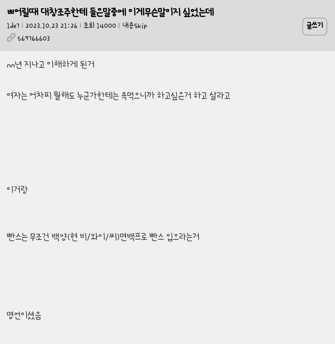 [흥미돋]어릴때 할머니한테 들은말중에 이게 무슨말이지 싶었는데 작성자세 레나|작성시간26.02.21|조회수53,121 목록 댓글 16 글자크기 작게가 글자크기 크게가 출처: https://hygall.com/569766603 다음검색 현재 게시글 추가 기능 열기 북마크 공유하기 신고 센터로 신고 댓글 댓글 16 댓글쓰기 답글쓰기 댓글 리스트 작성자단종 안아 | 작성시간 26.02.21 백양ㅋㅋㅋㅋㅋ 작성자엔트로피 | 작성시간 26.02.21 byc 바뀌었어? 작성자무화과깜빠뉴 | 작성시간 26.02.21 맞네 현명하시다 작성자내인내주 | 작성시간 26.02.21 빤스는 와이? 작성자소고기먹었지롱 | 작성시간 26.02.22 빤스는 면빤스가 최고다 정말 댓글 전체보기