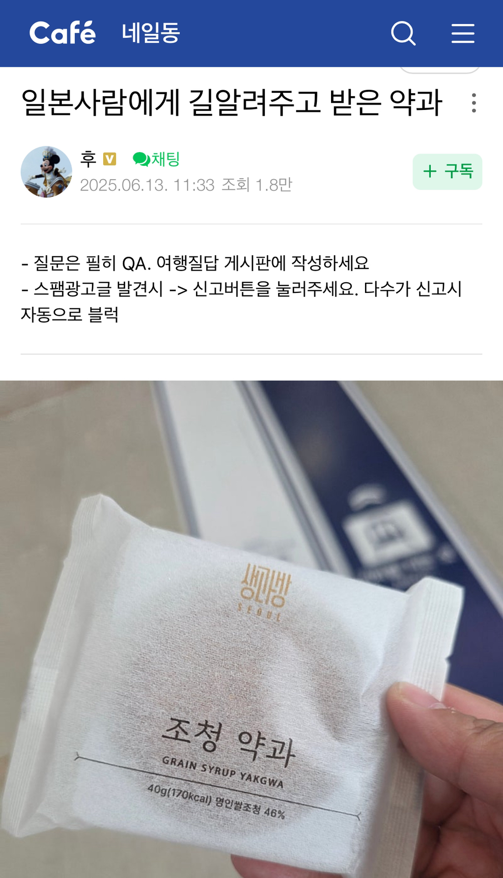 [스크랩] [흥미돋]지나가는 외국인한테 길 알려주고 받은거 작성자런도못한조|작성시간26.02.21|조회수41,770 목록 댓글 6 글자크기 작게가 글자크기 크게가 출처: https://m.cafe.naver.com/jpnstory/3997445서울역에서 한국인이 외국인한테생과방 약과 선물을 받는 세상.. 다음검색 스크랩 원문 : *여성시대* 차분한 20대들의 알흠다운 공간 현재 게시글 추가 기능 열기 북마크 공유하기 신고 센터로 신고 댓글 댓글 6 댓글쓰기 답글쓰기 댓글 리스트 작성자Goodbyes | 작성시간 26.02.21 저기 모든 맛이 맛있어 비싼게 흠인데 그런김에 저도 길을 알려드릴수있나요 작성자꺅두기 | 작성시간 26.02.21 와 얼마나맛았을까 작성자What it sounds like | 작성시간 26.02.21 와 생과방이야? 오ㅏ 부럽다 작성자녹차라떼에샷추가요 | 작성시간 26.02.21 존맛이지ㅜㅜㅜ 작성자코코넛짱맛 | 작성시간 26.02.22 여기꺼 존나 맛있더라 진심 약과원탑 댓글 전체보기