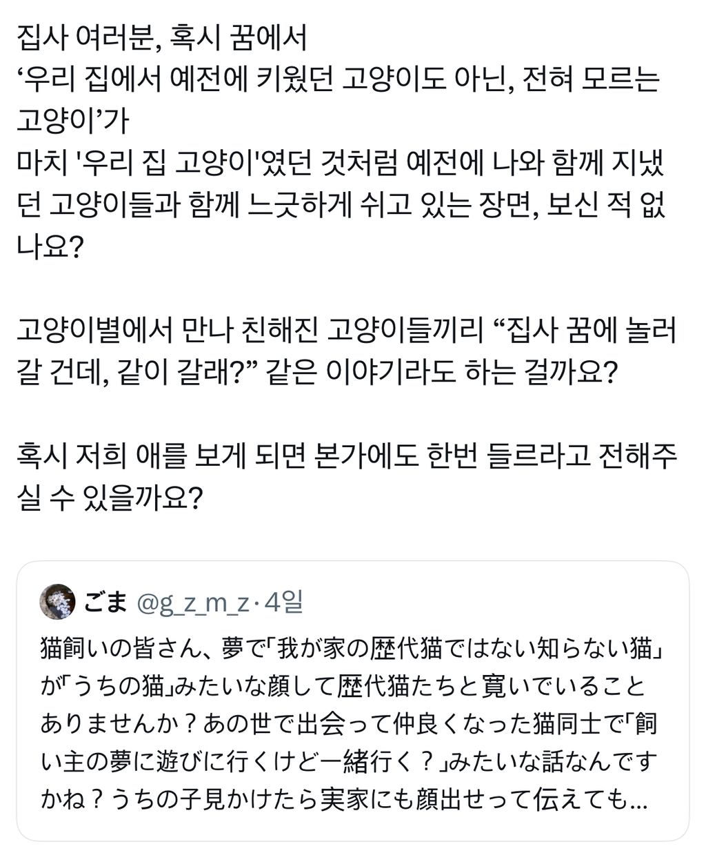 작성자과도한 띿놀 작성시간 26.02.21 나 우리 첫째 보내고 나중에 꿈꿨는데, 푸른 초원에 우리 첫째랑 닮은 젖소무늬 고양이들이 모여있더라고ㅋㅋ그 중에서 우리애 바로 찾아서 안았는데 고양이별에서 얼룩냥이들이랑 친구됐나보구나