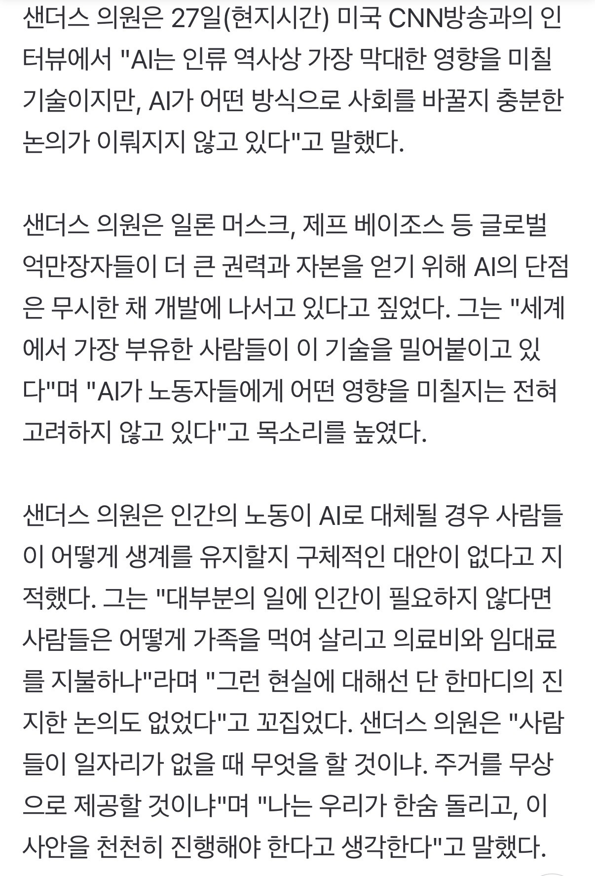 [흥미돋]버니 샌더스 "초부유층이 AI 밀어붙여… 일자리 고려 안 해", "일자리 대체 시 생계 유지 방안 없다"