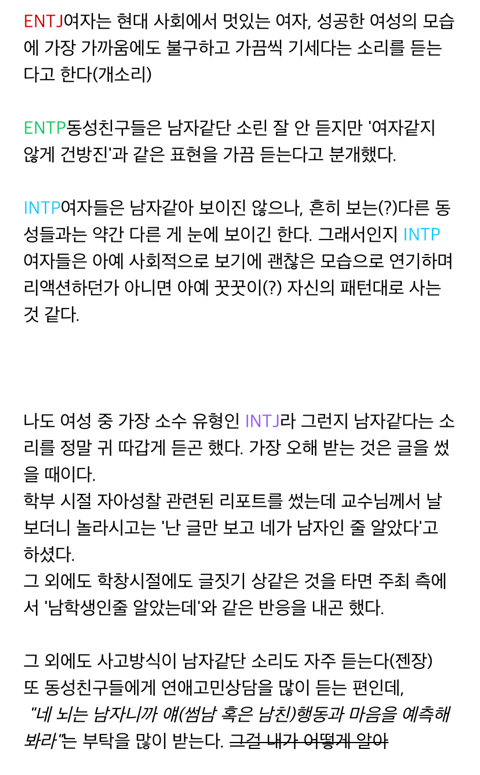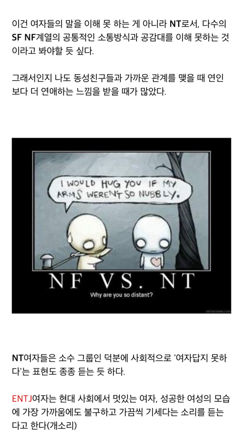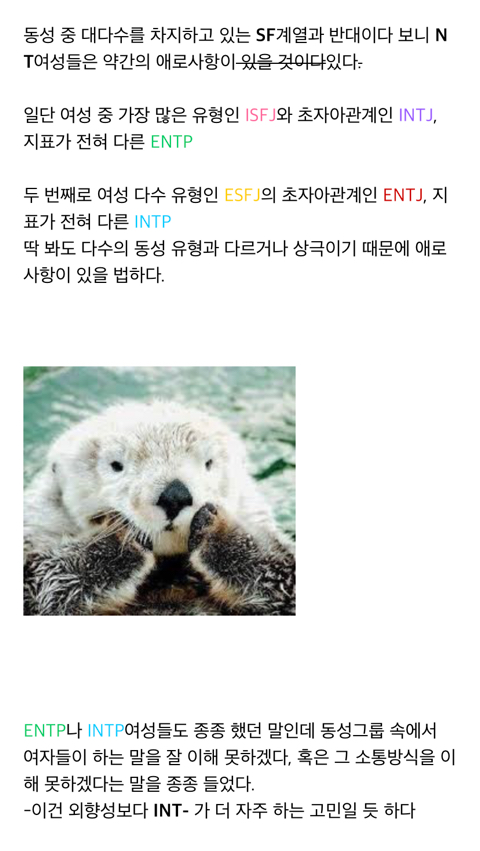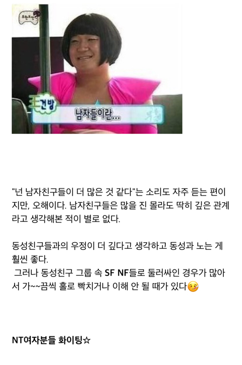 작성자안티몬 작성시간 26.02.23 평생 엔팁으로 살았는데 주위에 NT 여성이 잘 없음 샥알 ㅠ 같은 엔팁은 거의 못만나봤어... 만나도 남자였음ㅋㅋㅋ 그리고 볼 때마다 동족혐오통옴...