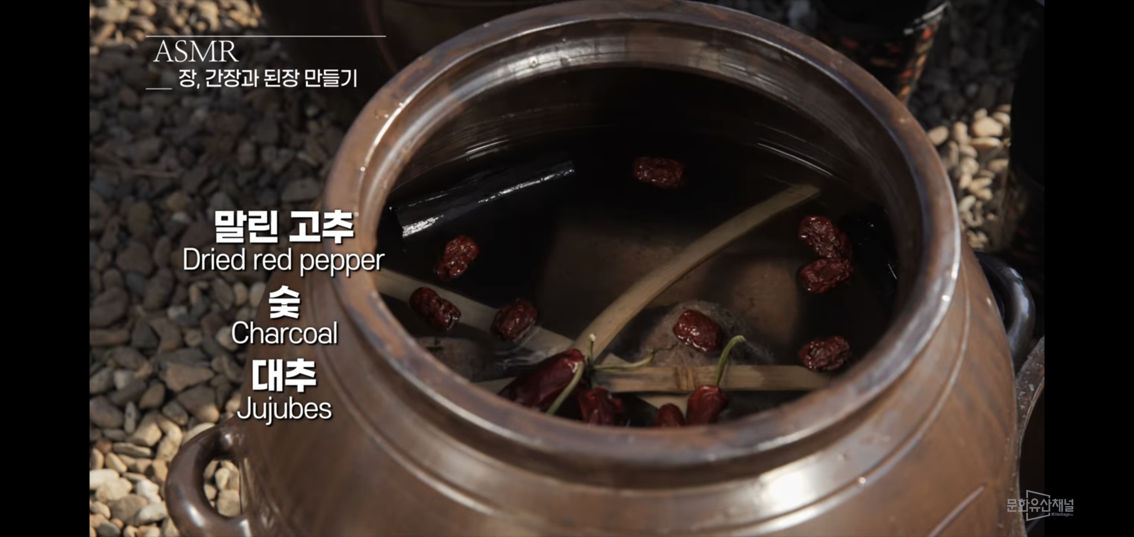만든 소금물 안에 메주, 건고추, 숯, 대추를 넣고 숙성