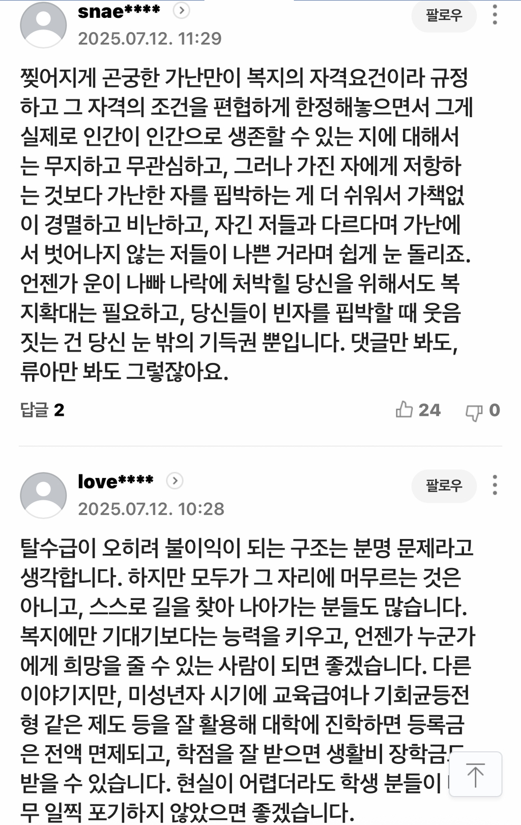 작성자점점더멀어지나봐 작성시간 26.02.22 이 글에서 주인공이 내 인생에 선택지가 두개인데, 이대로 기초수급자가된다 or 열심히 돈모으고 살아서 아파트를 산다 근데 내가 아파트를 사면 내 아파트값에 지장을 주는 모든 정책을 피해서 투표하겠다 이 부문에서 머리가 띵했음 아 이래서 사람들이 보수가 되는구나 더 가질수로 가진것을 절대 나눌수없구나