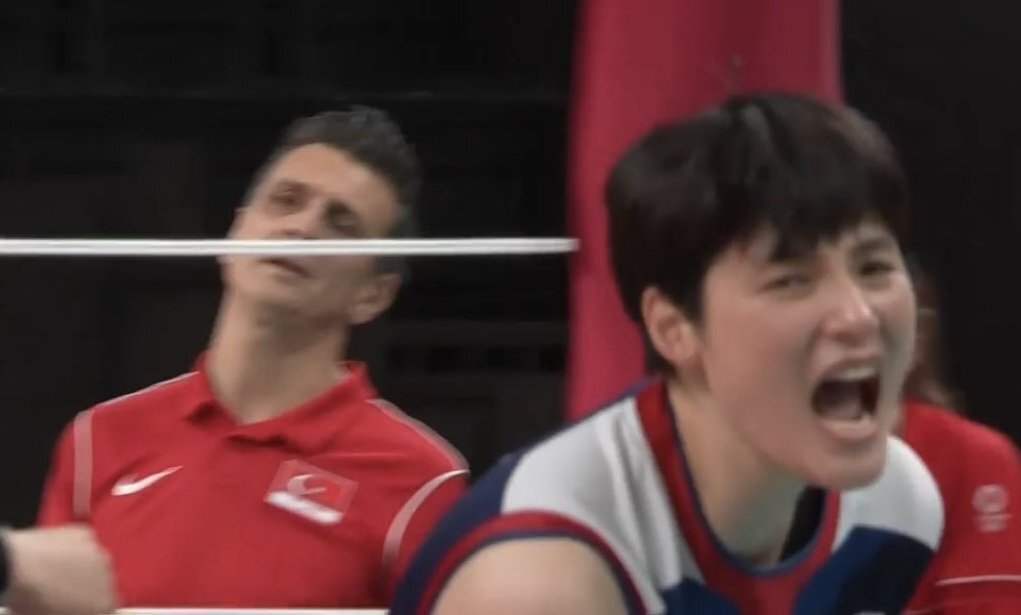 한국이 득점해서 작전판 던지는 터키감독(빨간옷)