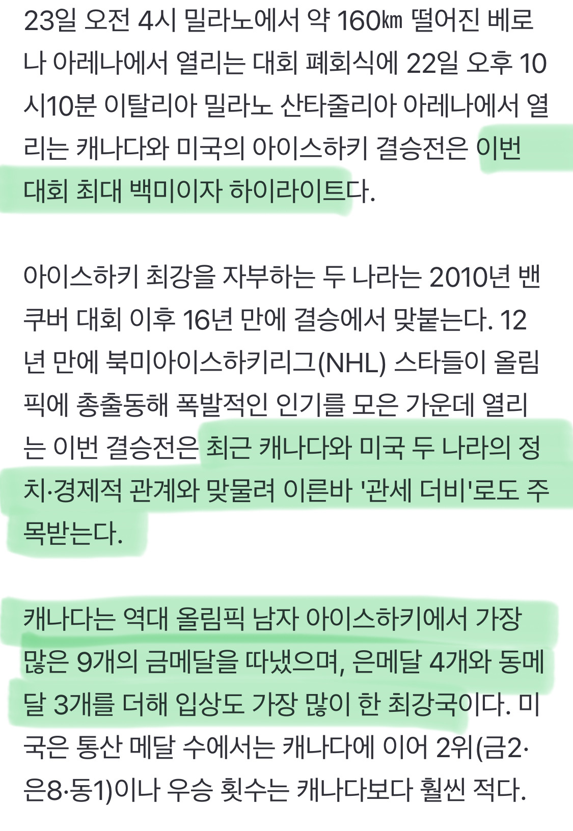 [여시뉴스데스크]캐나다 vs 미국 결국 만났다, 올림픽 최대 빅매치 남자 아이스하키 결승 관심 집중 작성자(본인닉네임).|작성시간26.02.22|조회수3,573 목록 댓글 6 글자크기 작게가 글자크기 크게가 출처: https://n.news.naver.com/article/022/0004107356?sid=104 다음검색 현재 게시글 추가 기능 열기 북마크 공유하기 신고 센터로 신고 댓글 댓글 6 댓글쓰기 답글쓰기 댓글 리스트 작성자코시려 | 작성시간 26.02.22 재밌겠다 작성자SKIMMILK | 작성시간 26.02.22 격하게 응원해요 캐나다 작성자KhvichaKvaratskhelia | 작성시간 26.02.22 오 재밌겠다 작성자팽팽놀고싶다 | 작성시간 26.02.22 예전에 뜨또 걸고 할때 개웃겼는데 이번에 뭐 안걸어?ㅋㅋㅋㅋㅋㅋ 작성자(본인 닉네임. | 작성시간 26.02.22 캐나다?하키?남자? 🫠 댓글 전체보기