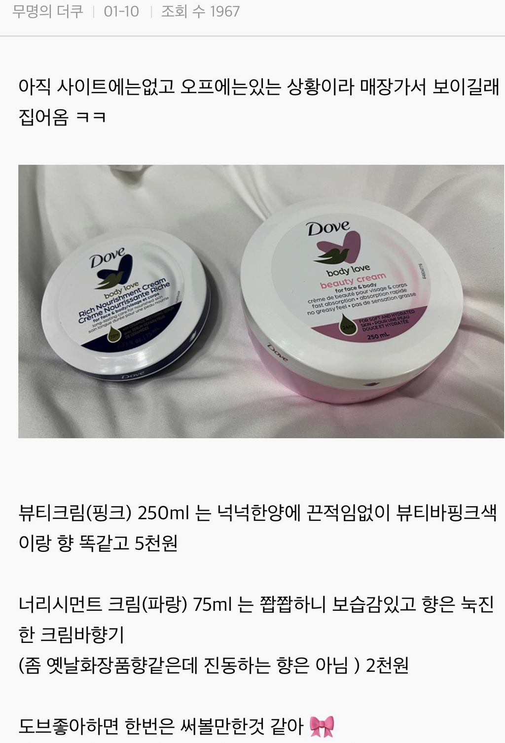 작성자삑삑디라라 작성시간 26.02.23 난 대충 수영가방에 들어갈 크기라서 샀는데 엄청 보습이 좋지는 않아 근데 분홍색은 진짜 도브 분홍색 냄새야