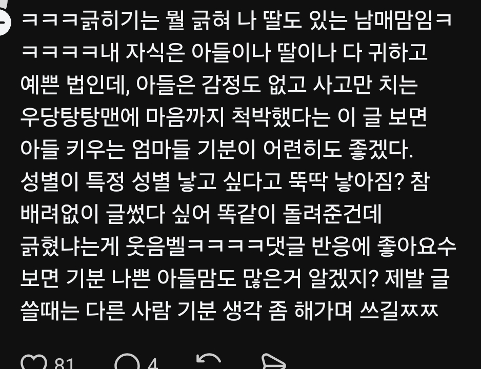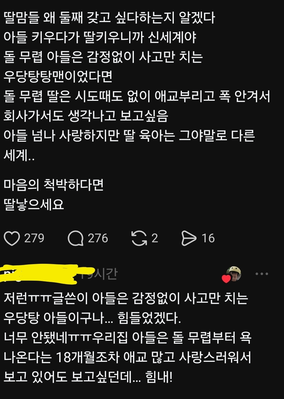 [흥미돋]딸맘들 왜 둘째 갖고 싶다하는지 알겠다 작성자ㅎㅈㄱㄷ|작성시간26.02.22|조회수67,640 목록 댓글 244 글자크기 작게가 글자크기 크게가 출처:https://www.threads.com/@hola.kulkul/post/DVBPj86krVs?xmt=AQF0Pwn_5B0KrZmvVjjbsFb9GWMODHovtfwuwcWPyV6pyRs5dzYvjwSpJGghvBghAL9CZ_Hb&slof=1 다음검색 현재 게시글 추가 기능 열기 북마크 공유하기 신고 센터로 신고 댓글 댓글 244 댓글쓰기 답글쓰기 댓글 리스트 작성자New York City | 작성시간 26.02.23 ㄷㄷ긁혔삼? 작성자느ㅣ개비최종학력리박스쿨 | 작성시간 26.02.23 그래놓고 돈은 아들들 다 물려주고 딸은 애교용으로 낳는거 아녀? + 간병용 작성자건조기를 살것이다 | 작성시간 26.02.23 ㅋㅋ 화가 많이 나신것 같은데 ㅋ 작성자치즈젤리 구경하세요 | 작성시간 26.02.23 숨숴 작성자엄청난마법사 | 작성시간 26.02.23 구구절절 댓글 전체보기