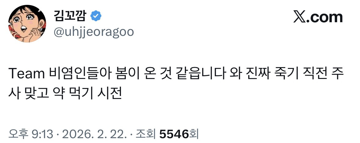 [흥미돋]Team 비염인들아 봄이 온 것 같읍니다 작성자오가닉제품|작성시간26.02.22|조회수21,025 목록 댓글 67 글자크기 작게가 글자크기 크게가 출처: https://theqoo.net/square/4103496462 다음검색 현재 게시글 추가 기능 열기 북마크 공유하기 신고 센터로 신고 댓글 댓글 67 댓글쓰기 답글쓰기 댓글 리스트 작성자국산 브로커 | 작성시간 26.02.23 콧물 지려ㅜ 작성자사뿐핑조아 | 작성시간 26.02.23 눈이 가려워... 작성자오잉또잉뾰잉 | 작성시간 26.02.23 어제부터 재채기 오짐 작성자느긔비테라픠 | 작성시간 26.02.23 반차쓰고 이비인후과 다녀옴ㅋㅋb형독감도 유행이라던데 비염여시들 파이팅,,, 작성자할게없슈 | 작성시간 26.02.23 재채기에 콧물에 코 건조함에 미쳐 댓글 전체보기