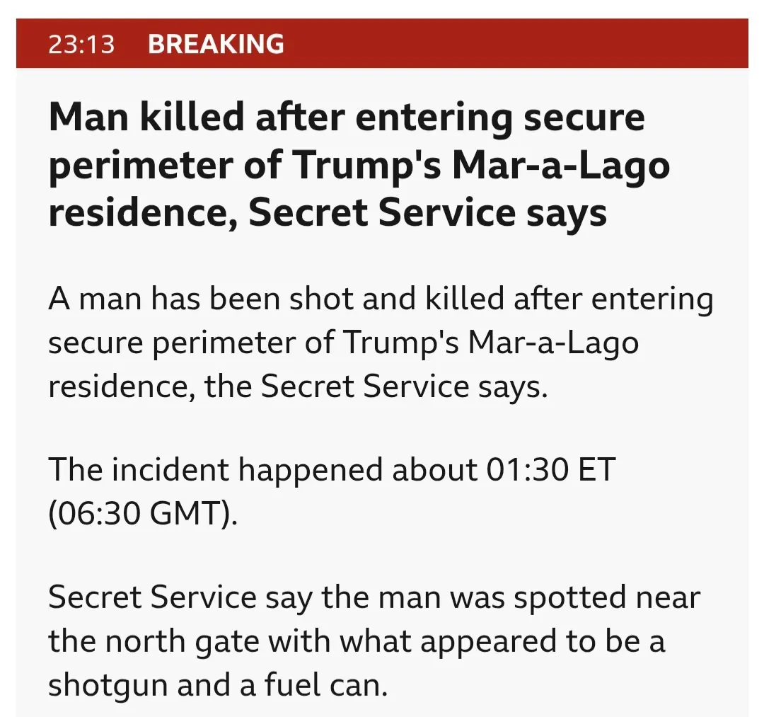 [기타]BBC속보) 트럼프 자택 총기괴한 침입시도, 경호국 사살 작성자ilysm|작성시간26.02.23|조회수87,581 목록 댓글 348 글자크기 작게가 글자크기 크게가 출처: 여성시대 ilysm트럼프 대통령의 마라라고 저택 보안 구역에 진입한 남성 사망, 비밀 경호국 발표비밀경호국은 한 남성이 트럼프 대통령의 마라라고 저택 보안 구역에 진입한 후 총에 맞아 사망했다고 밝혔습니다.사건은 동부 표준시 01시 30분경(GMT 06시 30분)에 발생했습니다.비밀 경호국은 그 남자가 북문 근처에서 엽총과 연료통으로 보이는 것을 들고 있는 것이 목격되었다고 밝혔습니다. 다음검색 현재 게시글 추가 기능 열기 북마크 공유하기 신고 센터로 신고 댓글 댓글 348 댓글쓰기 답글쓰기 댓글 리스트 작성자낭낭낭반지 | 작성시간 26.02.23 아이구ㅠ 작성자나애아바디 | 작성시간 26.02.24 아 ㅠ 의인이 또 ㅠ 작성자우오소이 | 작성시간 26.02.24 헐 작성자아이U | 작성시간 26.03.02 진짜 개까비ㅜ 작성자아뮤거나 | 작성시간 26.03.03 까비… 댓글 전체보기