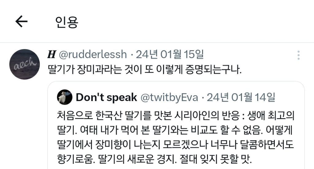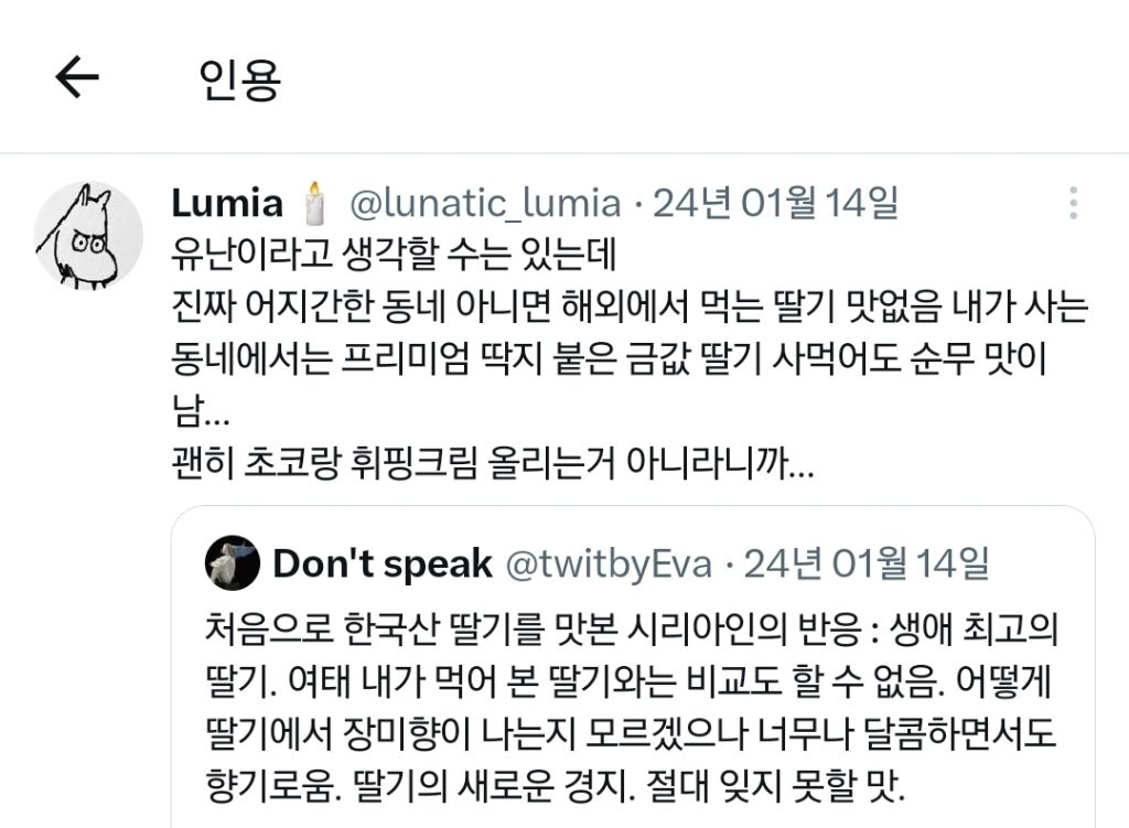처음으로 한국산 딸기를 맛본 시리아인의 반응 : 생애 최고의 딸기. 여태 내가 먹어 본 딸기와는 비교도 할 수 없음. 어떻게 딸기에서 장미향이 나는지 모르겠으나 너무나 달콤하면서도 향기로움. 딸기의 새로운 경지. 절대 잊지 못할 맛. pic.twitter.com/vFUCXhnLzk