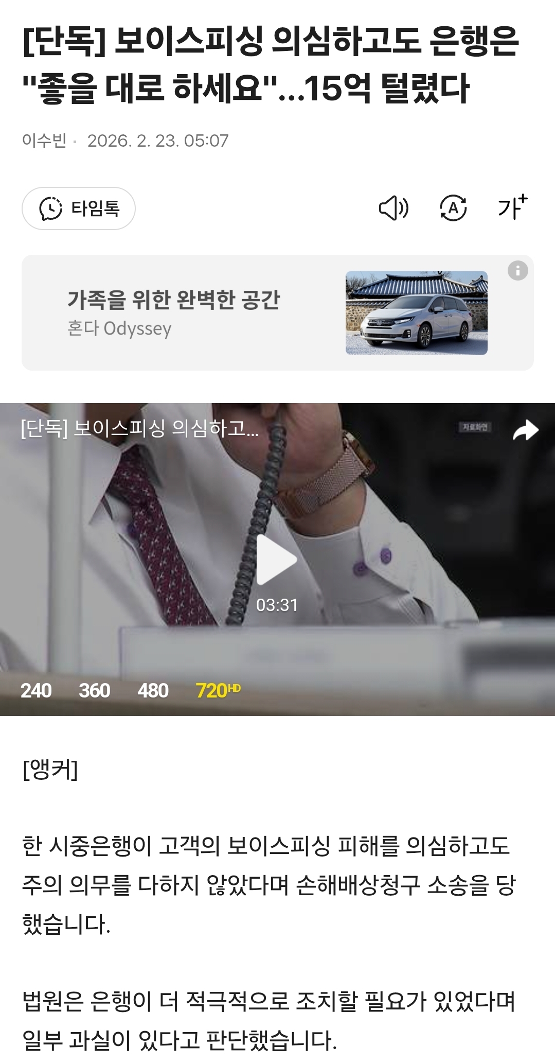 [여시뉴스데스크][단독] 보이스피싱 의심하고도 은행은 "좋을 대로 하세요"...15억 털렸다 작성자검동이|작성시간26.02.23|조회수45,154 목록 댓글 248 글자크기 작게가 글자크기 크게가 출처: https://v.daum.net/v/20260223050724933 ... 전문은 출처로.. 다음검색 현재 게시글 추가 기능 열기 북마크 공유하기 신고 센터로 신고 댓글 댓글 248 댓글쓰기 답글쓰기 댓글 리스트 작성자피스타치오초코딮 | 작성시간 26.02.25 기사 제목을 뭐 이렇게 씀ㅋㅋ 그럼 성인인데 뭐 어디까지 해줘야됨 작성자댄민 | 작성시간 26.02.25 노인들한테 저거 몇 번 당하면 심한 편견 생김우리나라는 시발 우기면 다 되는 줄 아는 상놈들 투성이 작성자긍정의 힘으로 | 작성시간 26.02.25 애도아니고 작성자낭낭낭반지 | 작성시간 26.02.26 참나 작성자고기사랑 | 작성시간 26.02.28 충분히 고지했구먼 댓글 전체보기