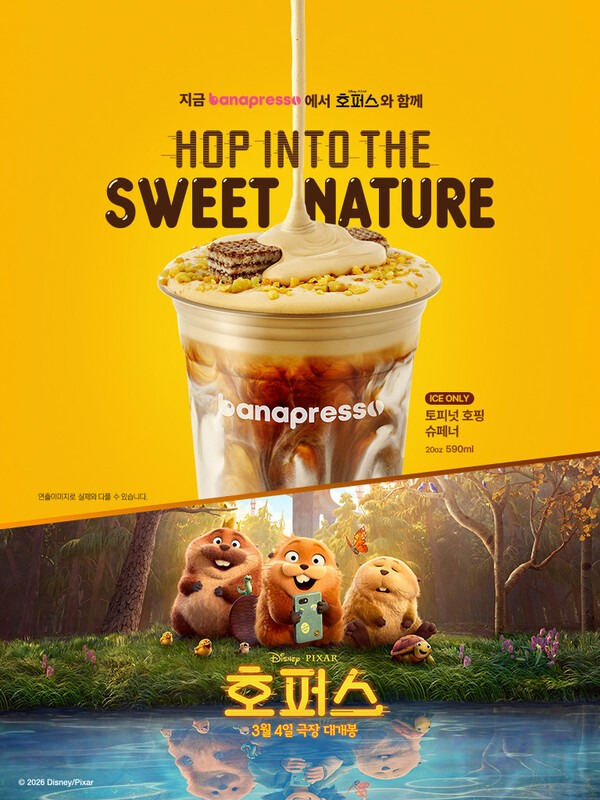 바나프레소가 내달 4일 개봉을 앞둔 디즈니·픽사 애니메이션 호퍼스의 감성을 담은 신메뉴 ‘토피넛 호핑 슈페너’를 금일 23일 선보인다.