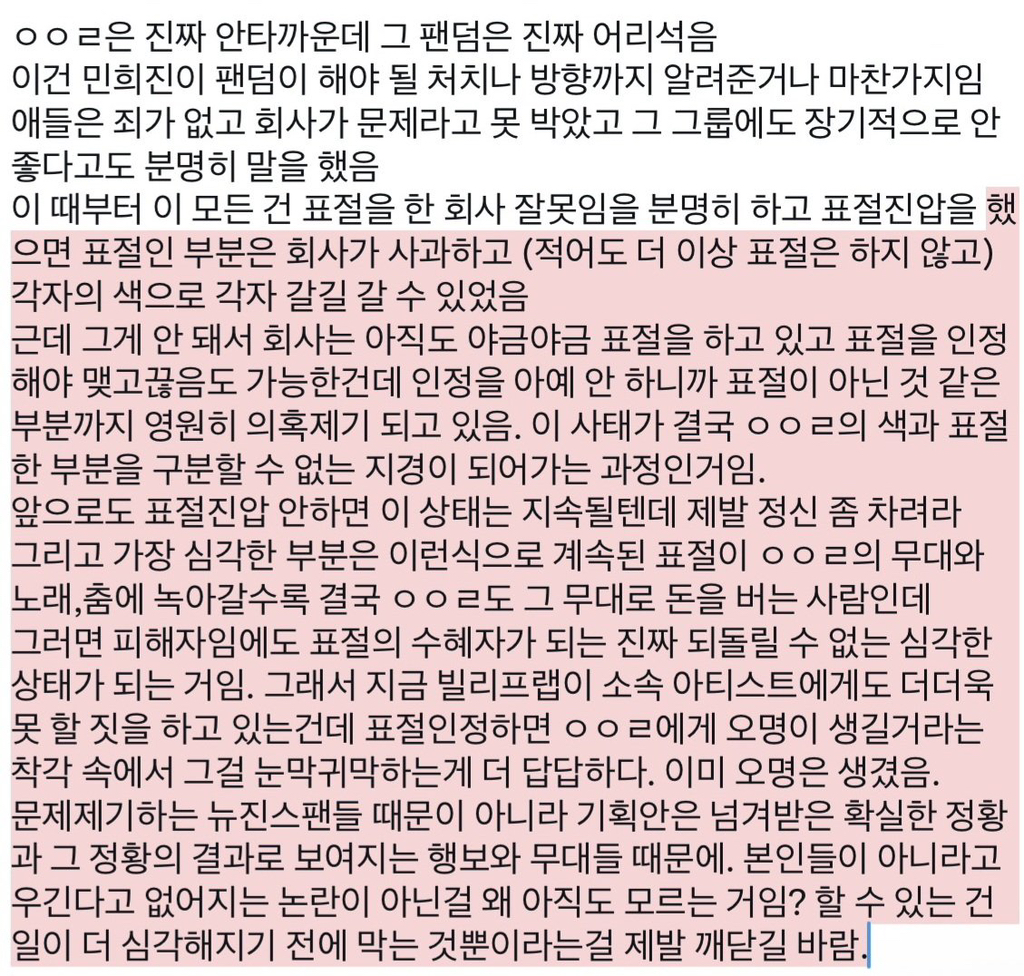 지금 아일릿을 더 좋아하게 할 전술로 대응해야지, 뉴진스와 민희진을 미워하라고 해봐야 아무 소용이 없고 그게 먹힌다 해도 아일릿을 절대 구원할 수가 없음