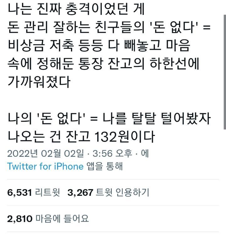 [스크랩] [흥미돋]돈관리 잘하는 친구의 '돈 없다' 와 나의 '돈 없다'의 차이 작성자쿨쿨꿀잠|작성시간26.02.23|조회수17,438 목록 댓글 31 글자크기 작게가 글자크기 크게가 출처 : https://twitter.com/ma1ahot/status/1488768240125841408?t=xB8mjJ8rvrf6ZZhqoneL6g&s=19훠궈 on Twitter“나는 진짜 충격이었던 게 돈 관리 잘하는 친구들의 '돈 없다' = 비상금 저축 등등 다 빼놓고 마음 속에 정해둔 통장 잔고의 하한선에 가까워졌다 나의 '돈 없다' = 나를 탈탈 털어봤자 나오는 건twitter.comㅠ 다음검색 스크랩 원문 : *여성시대* 차분한 20대들의 알흠다운 공간 현재 게시글 추가 기능 열기 북마크 공유하기 신고 센터로 신고 댓글 댓글 31 댓글쓰기 답글쓰기 댓글 리스트 작성자막멩이 | 작성시간 26.02.23 1 작성자열쩡열쩡열쩡쩡 | 작성시간 26.02.23 2로 산 적이 없음 imf 겪고 경제활동 하면서 단 한번도… 작성자저널미 | 작성시간 26.02.23 22 작성자Avengers | 작성시간 26.02.23 2인 사람 욕하고싶진 않지만 굳이 지인으로 두고싶지도 않은 그런 작성자고등어구이구이 | 작성시간 26.02.23 근데 2도 저축은 할거아니야 댓글 전체보기