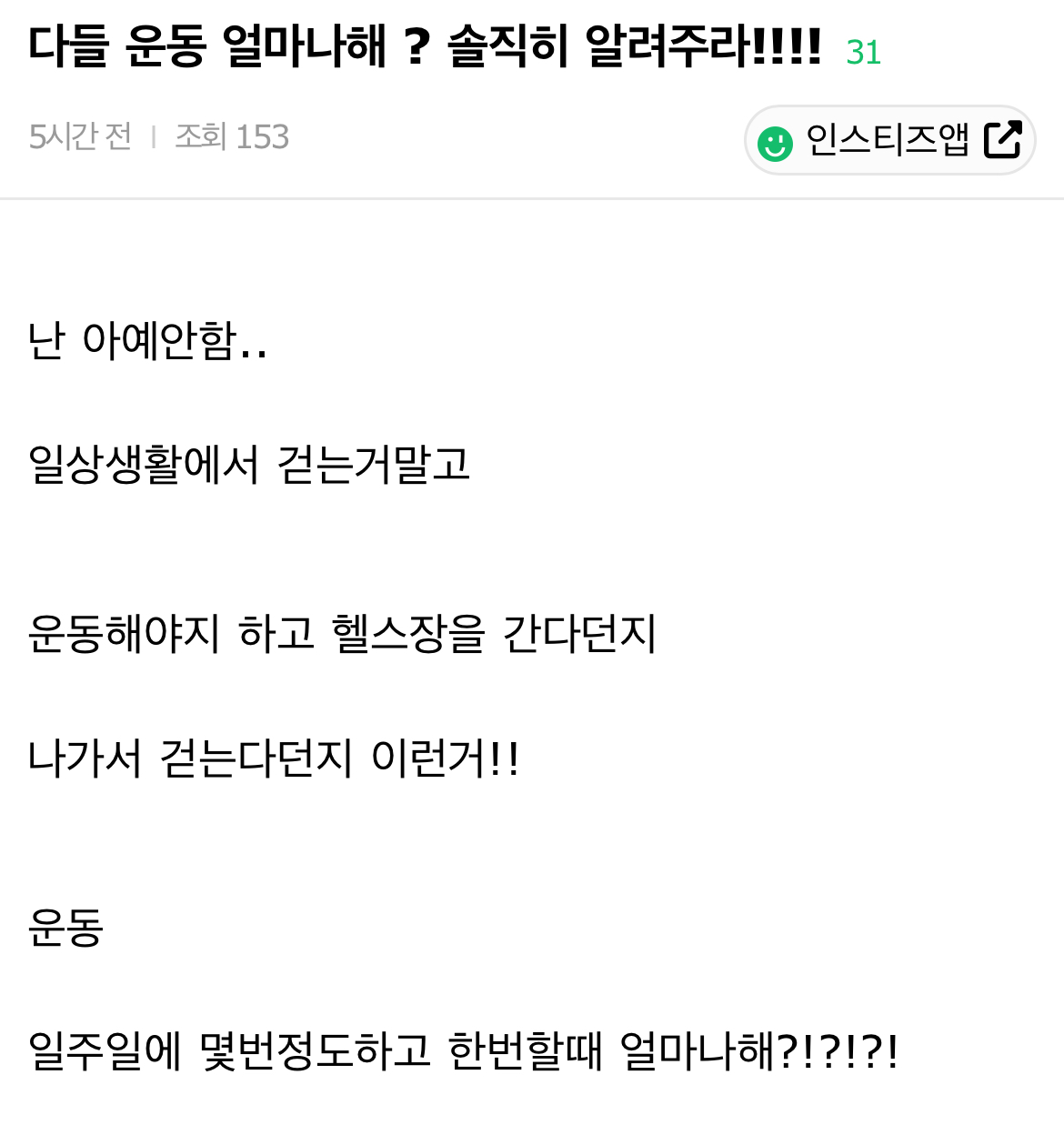 [스크랩] [흥미돋]다들 운동 얼마나해 ? 솔직히 알려주라!!!! 작성자모낙카|작성시간26.02.23|조회수11,866 목록 댓글 118 글자크기 작게가 글자크기 크게가 출처: 여성시대 설리야https://www.instiz.net/name/58918887[잡담] 다들 운동 얼마나해 ? 솔직히 알려주라!!!! - 인스티즈(instiz) 일상 카테고리난 아예안함..일상생활에서 걷는거말고운동해야지 하고 헬스장을 간다던지 나가서 걷는다던지 이런거!!운동 일주일에 몇번정도하고 한번할때 얼마나해?!?!?!www.instiz.net난 매일 산책 30분..내 주변은 매일 헬스 1시간은 기본 하더라(다이어트X 살려고) 다음검색 스크랩 원문 : *여성시대* 차분한 20대들의 알흠다운 공간 현재 게시글 추가 기능 열기 북마크 공유하기 신고 센터로 신고 댓글 댓글 118 댓글쓰기 답글쓰기 댓글 리스트 작성자슈퍼울트라숑숑 | 작성시간 26.02.23 0 작성자AsIam | 작성시간 26.02.23 주 4-5일 (슬로우)러닝+등산 근력운동 해야되는데 잘 안하게 됨 ㅠ 반성중 작성자밤마다찾아오는유령 | 작성시간 26.02.23 주 5일 매일 두시간 작성자성심당말차시루 | 작성시간 26.02.24 주5~6일 헬스2시간 주3-4회 플라잉요가 작성자티니티니핑 | 작성시간 26.02.24 난 헬스 3번 기본 하고 4번하면 죽겠던데.....다들 어케 4-5회 헬스해...? 댓글 전체보기