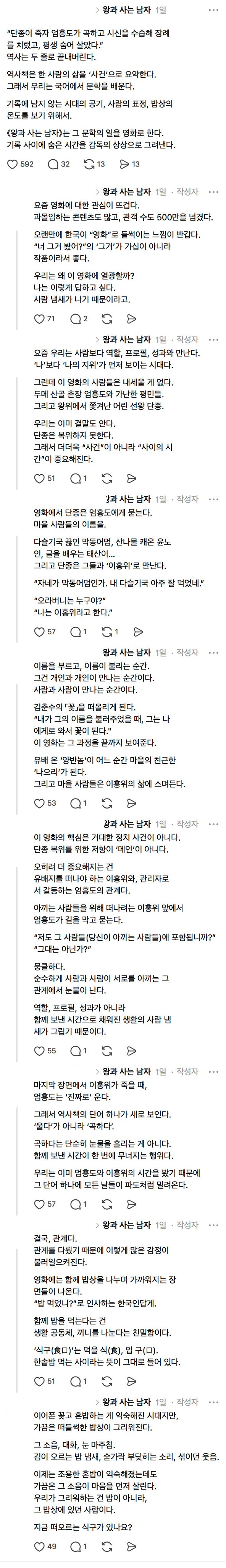 [흥미돋]어느 국어 선생님의 ‘왕과 사는 남자’ 후기 작성자방과후태리쌤|작성시간26.02.23|조회수53,521 목록 댓글 84 글자크기 작게가 글자크기 크게가 출처: https://www.threads.com/@de_mea_vitaa/post/DVCdAiAE4Vb대박 두글자로 끝내는 나와는 다르다이래서 국어선생님은 필력은 다르구나 느낌ㄷㄷ 다음검색 현재 게시글 추가 기능 열기 북마크 공유하기 신고 센터로 신고 댓글 댓글 84 댓글쓰기 답글쓰기 댓글 리스트 작성자느개비 맥도날드캐챱도둑 | 작성시간 26.02.24 작성자난 다 잘돼 | 작성시간 26.02.24 이걸 보고 개쩐다 세글자 말할줄 아는 내가 실타 작성자98년도에는요 | 작성시간 26.02.27 와 ...이 사람 누구야 글 너무 잘 쓴다.....진짜 제대로 분석했고 내 최애 대사까지 써주네퍼와줘서 너무 고마워 귀한 글을 봤다 작성자멀로하쥐 | 작성시간 26.03.01 진짜 한 단어 단어 다 공감돼 작성자번지며 차오를래 | 작성시간 26.03.24 허엉 ㅜㅜㅜ 댓글 전체보기