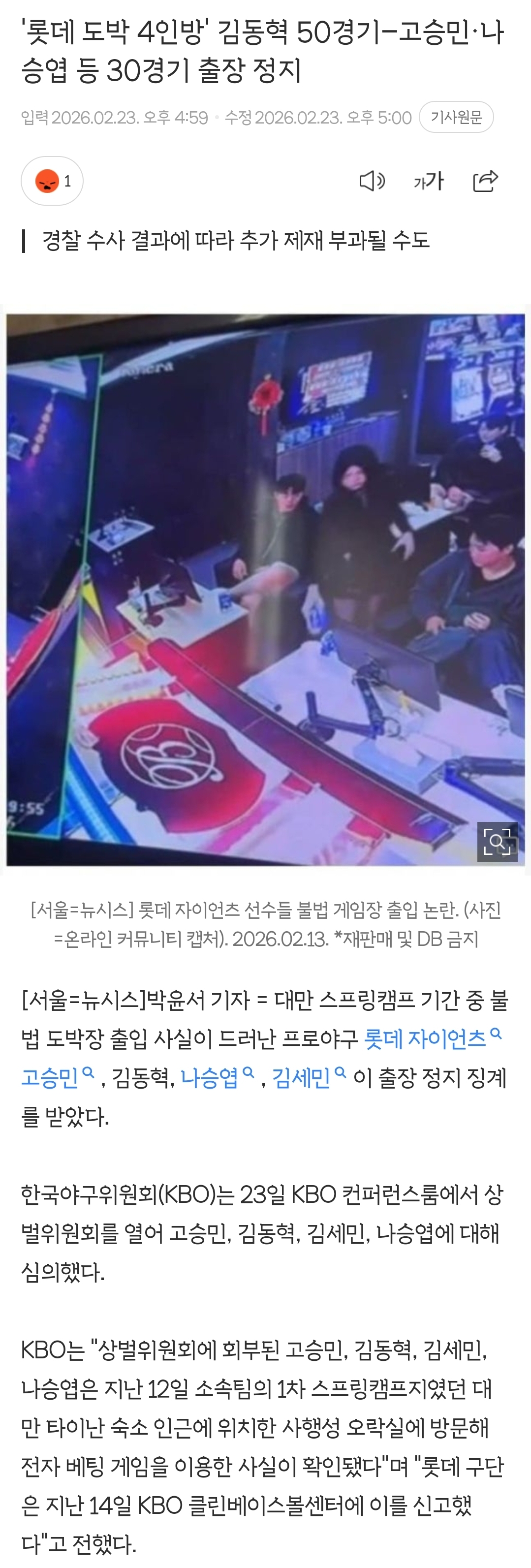 [여시뉴스데스크]'롯데 도박 4인방' 김동혁 50경기-고승민·나승엽 등 30경기 출장 정지 작성자팟즈|작성시간26.02.23|조회수6,326 목록 댓글 63 글자크기 작게가 글자크기 크게가 출처: 여성시대 팟즈https://m.sports.naver.com/kbaseball/article/003/0013783268'롯데 도박 4인방' 김동혁 50경기-고승민·나승엽 등 30경기 출장 정지여기를 눌러 링크를 확인하세요m.sports.naver.com 다음검색 현재 게시글 추가 기능 열기 북마크 공유하기 신고 센터로 신고 댓글 댓글 63 댓글쓰기 답글쓰기 댓글 리스트 작성자아아두잔째 | 작성시간 26.02.23 약해 너무 약해 작성자EVIAN | 작성시간 26.02.23 이래서 야구가 싫어..^^ 작성자기대싸치김 | 작성시간 26.02.23 크보 징계도 손봐야한다 벌금 300만원 뭐 이렇던데 연봉 억대 넘어가는 선수들이 많은데(저 선수들이 전부 안그런것은 알고있음) 300만원은 껌 아니냐 작성자얼그레이바닐라팁 | 작성시간 26.02.24 밥벌이가 쪼들릴만큼의 벌은 줘야 안하지 작성자억까그만 | 작성시간 26.02.28 에바 너무 약하다 댓글 전체보기