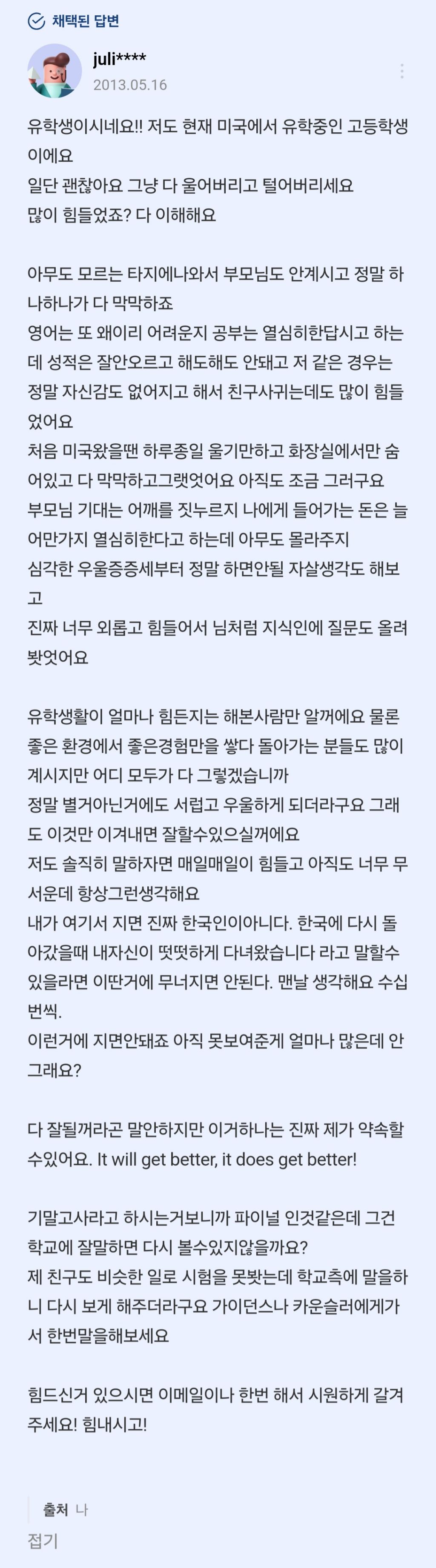 뉴욕대 나온 거 보니 유학했었나봐. 유학생활 힘들다는 글에 위로 답변을 달았는데 저 답변이 고등학생 때래.. 지금 나도 위로 받았는데요ㅠ