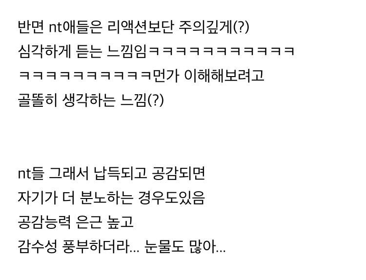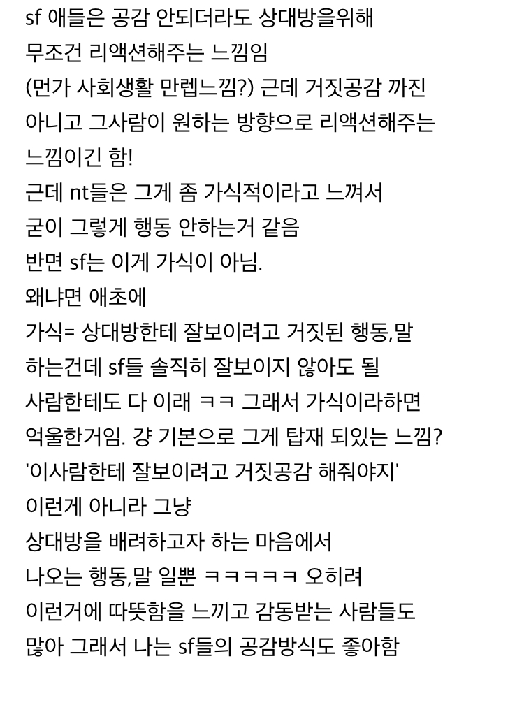 글고 나이먹을수록 보통 단순 감정거리 고민은 이야기를 안하게되니 내고민이야기할때 sf같은 반응하면 아 내가 징징대는거로생각하나?(앞전에 본인들 고민거리 다이야기함) 이런생각들어서 nt 식이 더 나은더같아.. -