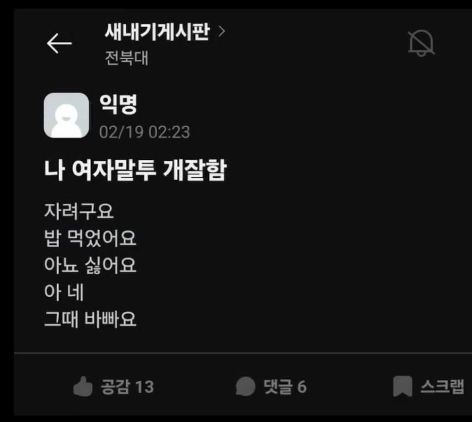 [흥미돋]나 여자 말투 개잘함.jpg 작성자이재는이재명|작성시간26.02.24|조회수17,856 목록 댓글 9 글자크기 작게가 글자크기 크게가 출처: 여성시대 이재는이재명 ㅋㅋㅋㅋㅋㅋㅋㅋ바빠요 아뇨싫어요꺼지세요 다음검색 현재 게시글 추가 기능 열기 북마크 공유하기 신고 센터로 신고 댓글 댓글 9 댓글쓰기 답글쓰기 댓글 리스트 작성자VTIC 신청려 | 작성시간 26.02.24 역시 언어는 반복이다 작성자부메리카노 | 작성시간 26.02.24 언어도 반복개그도 반복역시 반복 작성자냥르장머리 | 작성시간 26.02.24 여잘알 작성자루기헴 | 작성시간 26.02.24 잘아네 작성자허니캐모마일 | 작성시간 26.02.24 진짜 잘하긴한다 댓글 전체보기